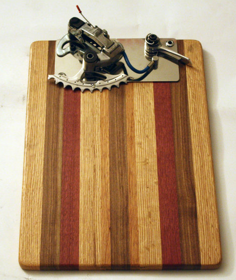 Our former colleague Aaron Popelka is a multi-talented individual. He currently works at Bicycle Revolutions here in Philadelphia, and is head mechanic there. In his off-time, he makes awesome guitar pedals and his newest project is pretty cool as well. He makes super deluxe clipboards out of discarded cycling components. Check out the link and see what he is up to. When you move the shifter, it raises and lowers the derailleur to secure or release your papers or what ever is on the board. It also has a friction or indexing mode! Pretty cool!