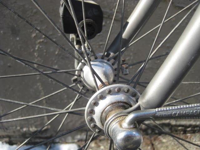 The bike has some interesting components. The front brake is an early Mathhauser hydraulic brake. The rear brake is a Scott Super Brake, both unique early designs. The bike is also equipped with a mixture of early Dura Ace components. The rear wheel has an early Phil Wood hub with tied and soldered spokes for a more rigid wheel and the front wheel is a Campagnolo low flange record hub with crow’s foot lacing. A long cage rear derailleur with a more touring spread freewheel is a bit puzzling in conjunction with the more “racey” wheels. I wonder what Mr. De Long was thinking when equipping this bike? Was he experimenting with these new components? I am sure there was a good reason as he was always looking for new and innovative ideas. It is humbling to work around and investigate his bikes. I have a lot of respect for the work he did to further the sport that we love. Enjoy!