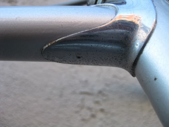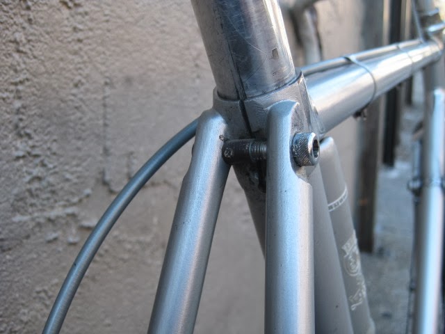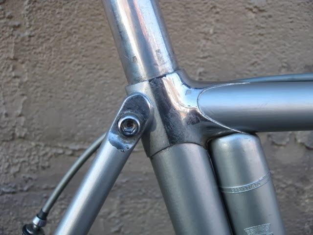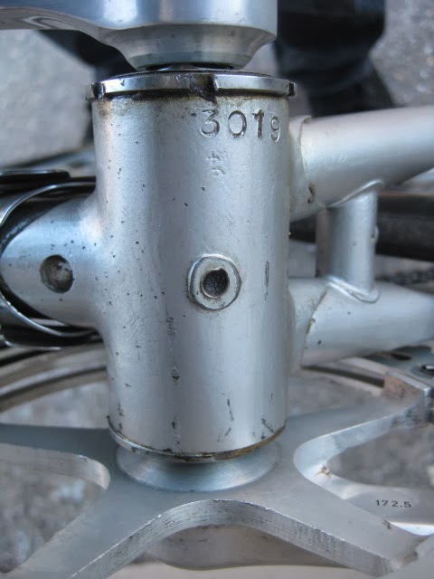 It is has also been a bit difficult in dating it because some details are inconsistent with the time line. The frame is pre 1968 because of the fact that there are no holes in the head lugs, it also has fender eyelets which were removed from production in the early 70’s. There are no holes in the fork reinforcements (tangs) also which happened in the early 70’s. The bottom bracket shell also has an oil port, which disappeared in the mid 60’s. The enameled brass head badge is 51mm tall, which were used between 1958-1971.T he distinctive fully sloping fork crown is seen in Ron Kitching’s 1963 catalog. It also has the older two bolt Seat binder attachment as opposed to the later three piece design which appeared in 1972. There are also no brazed on cable guides or stops except for the rear derailleur housing stop. All that is consistent, but then there is the serial number: 3019, which puts it in the 1970’s. I have been told that Cinelli serial numbers can be all over the place, so I am concluding that it resides in the early to mid 1960’s.