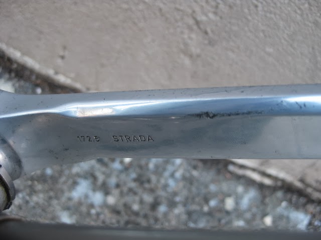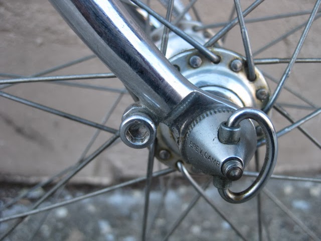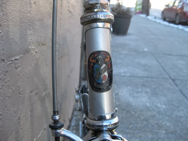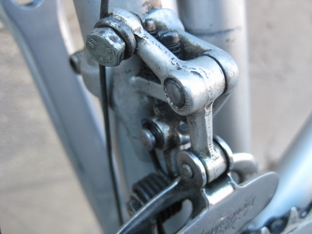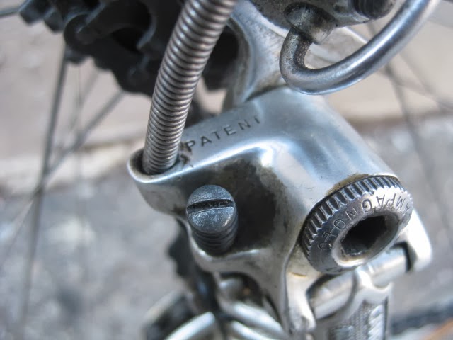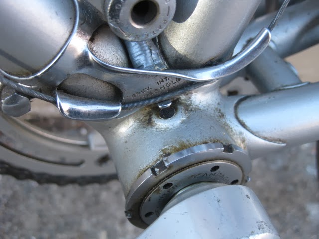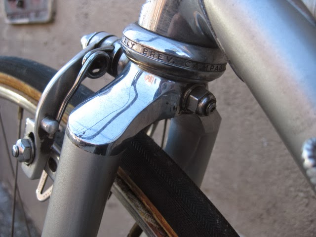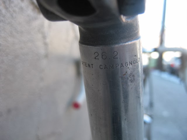 Some of the components are pretty cool as well. It is equipped with first generation Campagnolo Record brakes without logos which were introduced in 1968. It has a 144 BCD Campagnolo Record crank set without a date code. The 144 BCD was introduced in 1967, replacing the 151 BCD. It is equipped with the alloy Campagnolo derailleurs, which were introduced in 1967. The rear derailleur only is stamped “patent”, no year. The front derailleur does not have the lip that the C.P.SC. demanded in the late 70’s. Also, no circlip holding the arms on, pressure fit. Also of note is the steel Cinelli headset spacer, they are quite rare these days and this one is in great shape. Usually they were discarded by mechanics, so few survive.