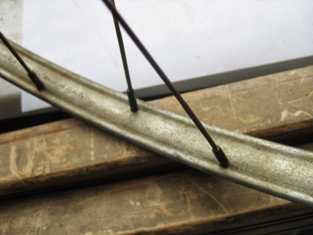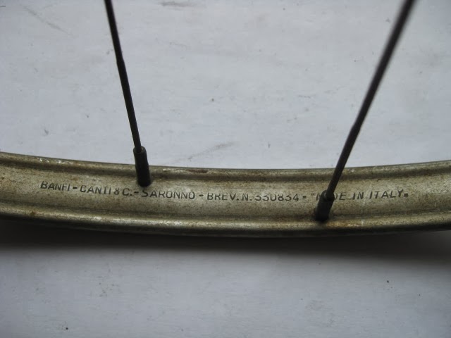 This is a pretty cool wheel set we recently acquired. The rims are the real stand out feature to me. They are stamped Banfi Canti & c.- Saronno- Brev.N. 330834-“made in Italy”. this company was mostly known for making motorcycle rims. They did also make bicycle rims, which were a bit of a rarity. These rims are only 5mm tall! The spoke drillings are very close to the edges of the rim as well, 5mm again. The spoke nipples are filed off flush with the tire side of the rim, I imagine a very time consuming process.