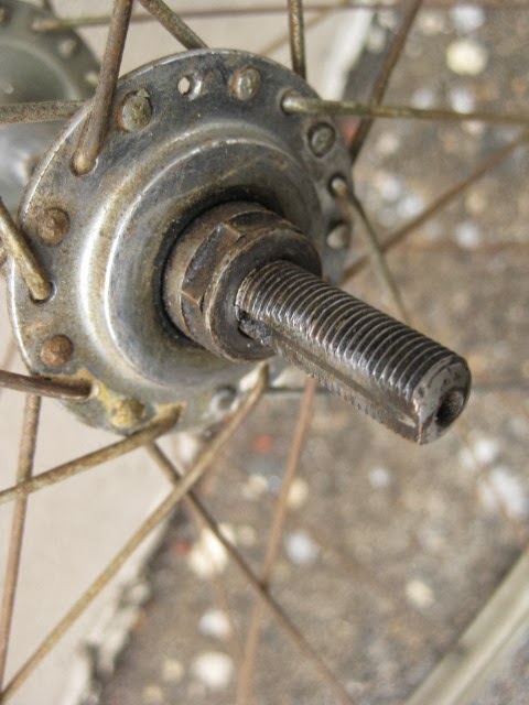 The rear hub is single side track threading. No lock ring or axle nuts included. Also missing the non drive side lock nut. Front wheel is missing the axle assembly all together. The bearing races feel fine though.