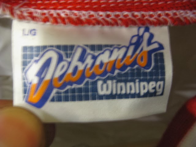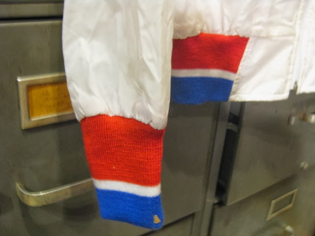 Made of a wind breaker type material with front pockets. Logos are screen printed on front and back. Collar and cuffs are not stretched out at all! Virtually no yellowing of the material.