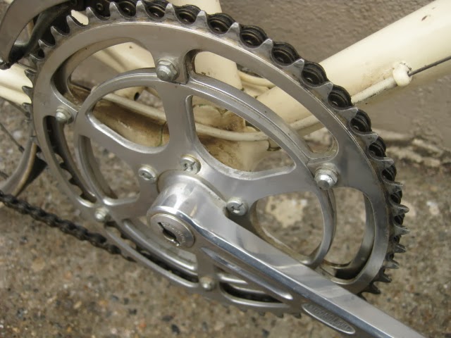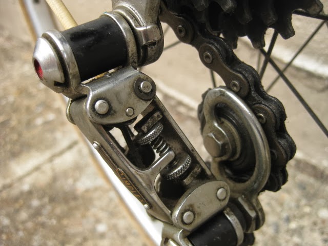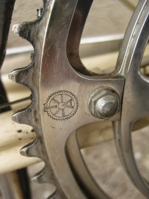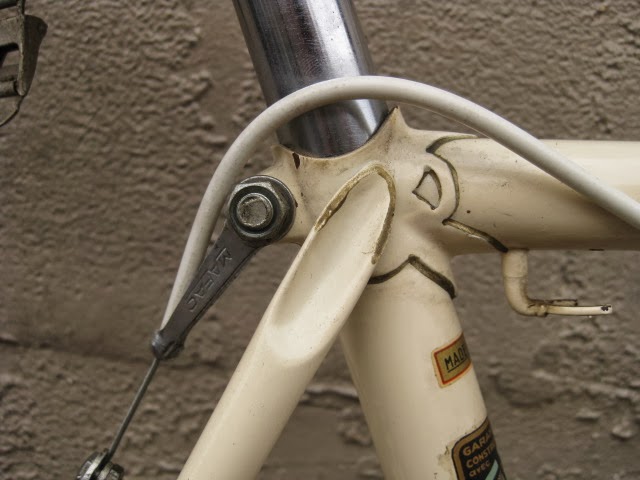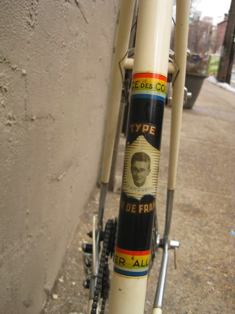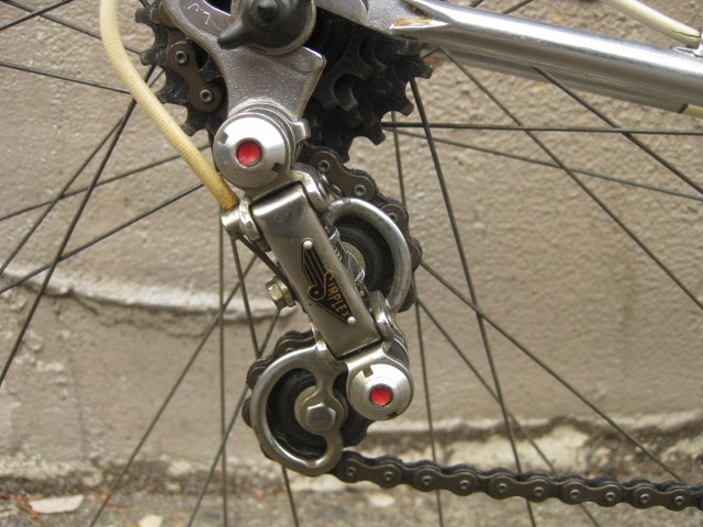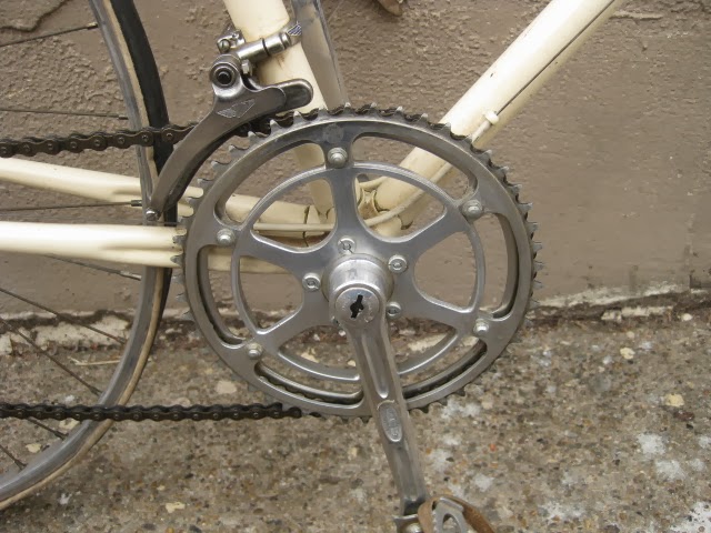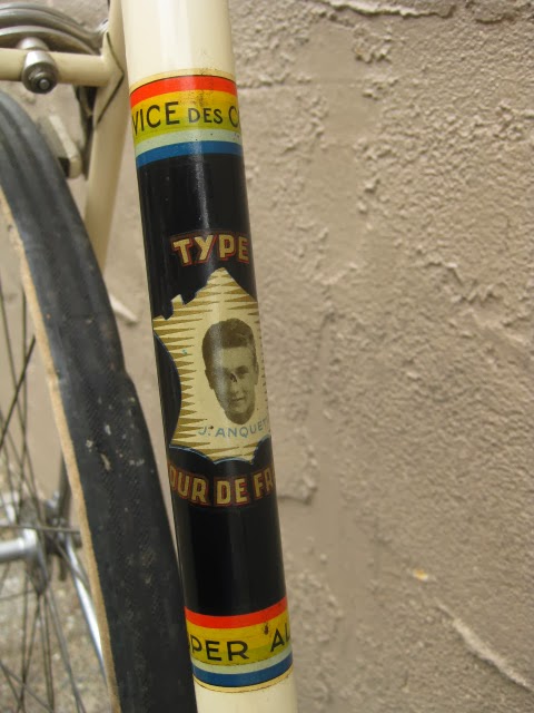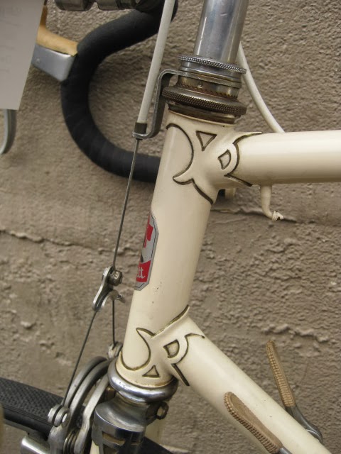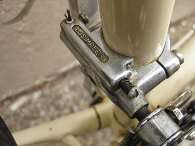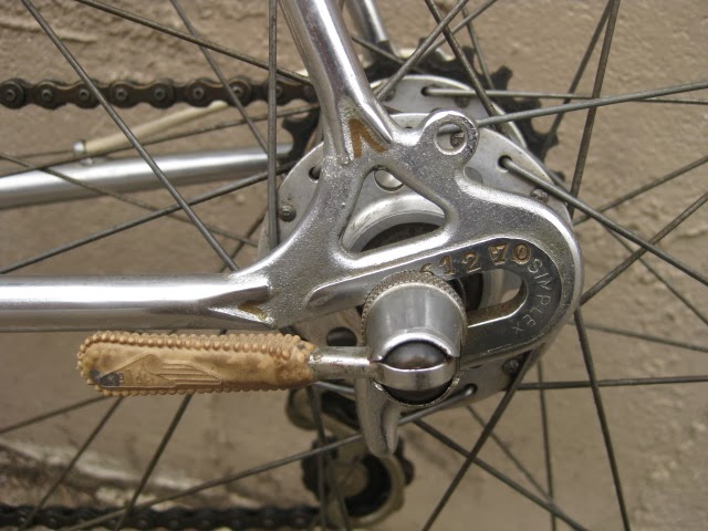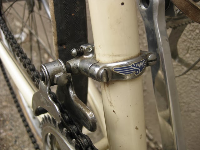 It is built with Reynolds 531 tubing with the French decal, which I always liked. Jaques Anquetil’s face graces the elaborate seat tube decal. He was one of the classic champions of the era and is regarded as one of the best ever. The typography of the down tube and top tube decals is amazing in my opinion, they remind me of Daniel Rebour’s style of illustration. Nice head lugs with a lot of shore line and window cut outs, gold lug lining throughout. Original paint which at this point has aged to a nice warm cream color. One of my favorite head badges is affixed to the head tube. The serial number of 61270 is stamped on the rear non drive side of the Simplex drop out. a neat little detail is the rear pump peg, pretty unique.