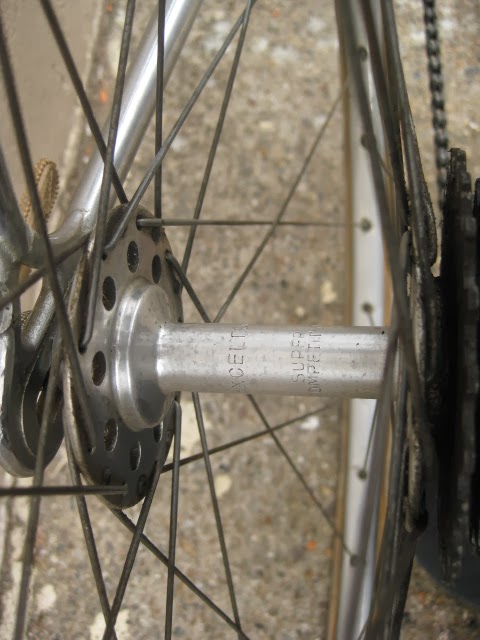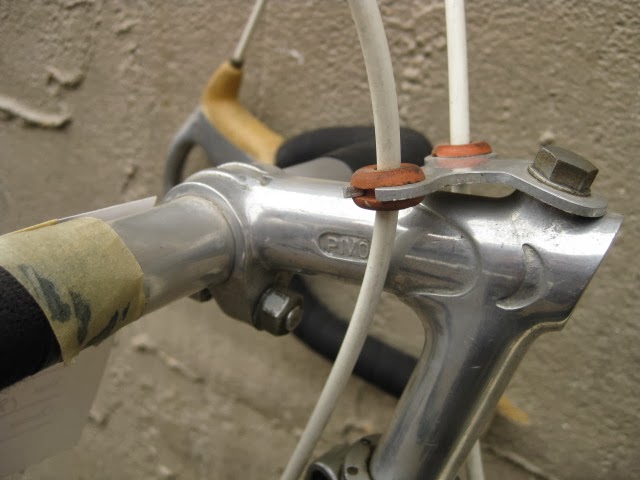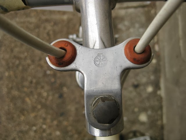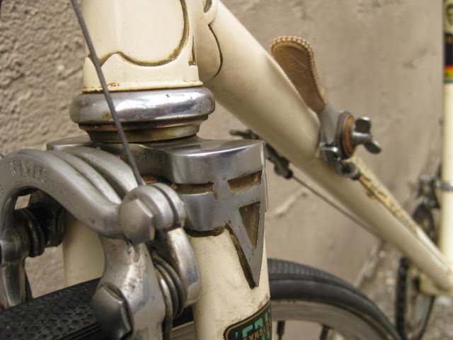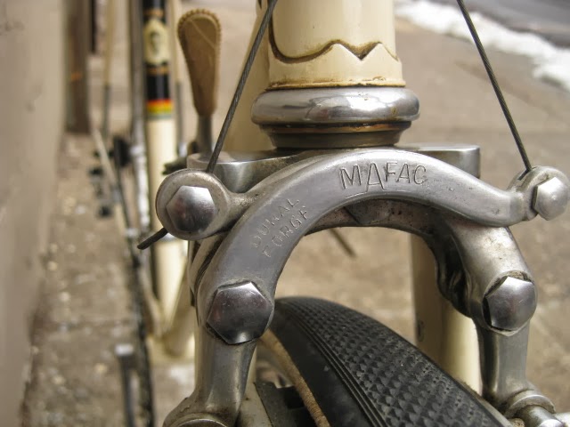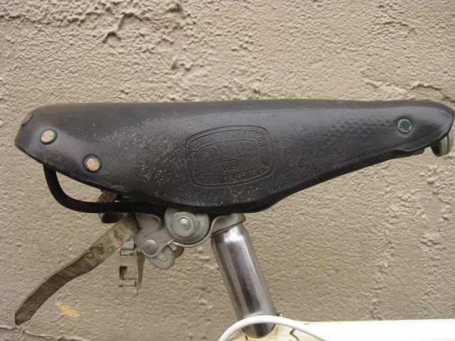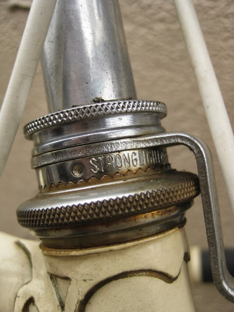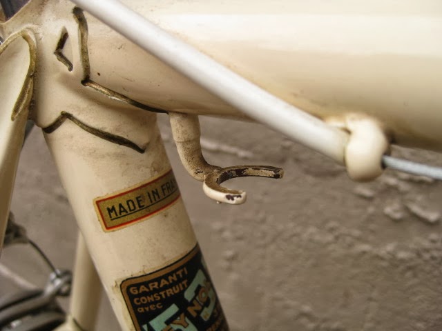The componentry is also top French quality of the period. Rear derailleur is a Simplex JUY export 61. See the photo for the unique mechanism for adjustment in the parallelogram. Front derailleur is a Simplex LJ 23 (second version). The first version had a riveted badge where as this one has a decal.  Simplex Shifters with nice wingnuts, braze on style. Early Stronglight 49D cranks with T.A. adapter and professional criterium T.A. chain rings in half step gearing. Cool acorn nuts for attachment. The hubs are Exceltoo Super Competition model, which were a little known French company that made nice hubs.Simplex skewers with intact wingnuts and the very rare white boots in great shape. Early Mafac Duralforge brakes and Mafac levers with pristine half hoods. Pivo bar and stem combo with the T.A. cable guide, always a nice touch. Stronglight P3 headset and Ideale no.88 saddle round out the build. Also of note is the Ideale seat clamp which has the tabs for the toe strap to go through and attach a tubular tire under the seat. I have never seen this version before, any info?