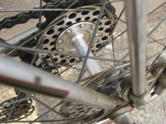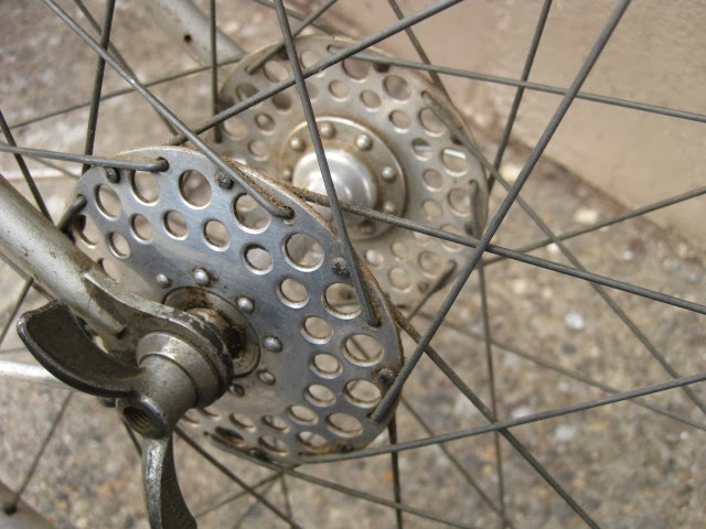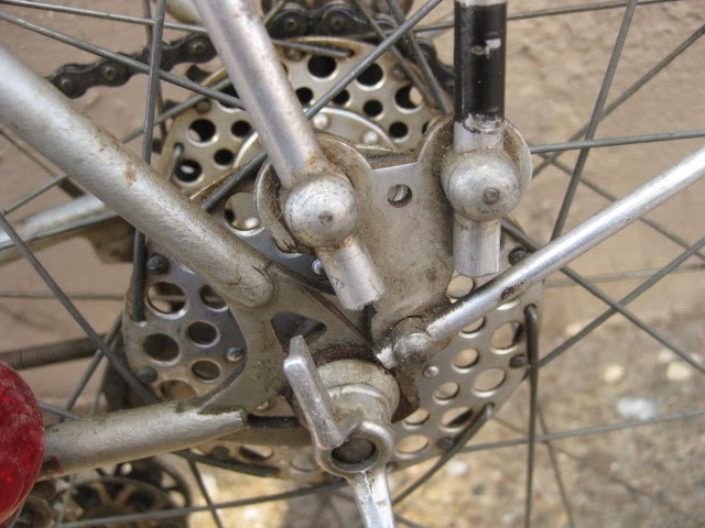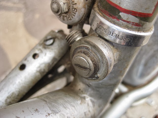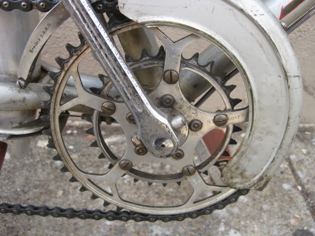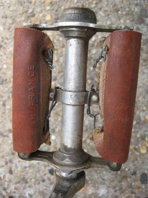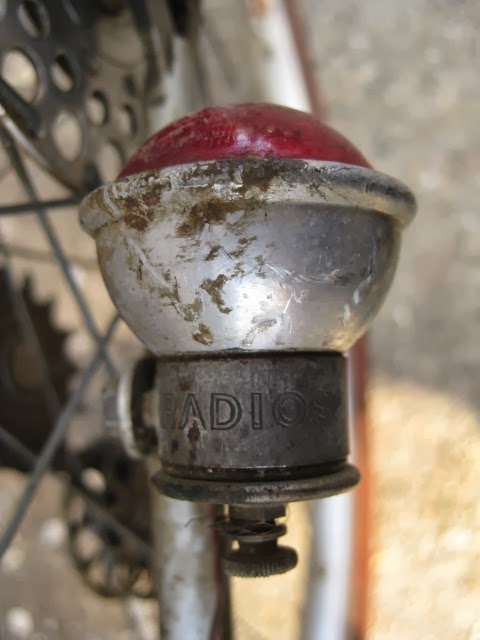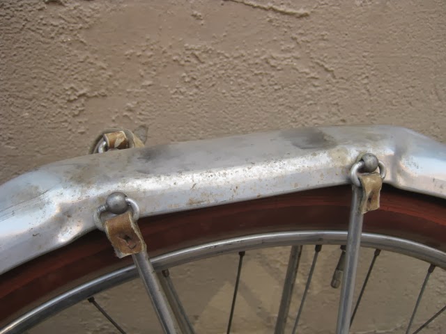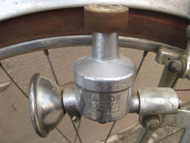 The bike has the proprietary derailleur system and early index shifter. It functions well. 650B demi balloon tires on early Mavic rims laced to Prior high flange hubs. Easily one of the most beautiful hub sets ever produced, in my opinion. Le fol alloy fenders, the rear fender has a platform built into it for carrying items with two leather straps, very rare. Ideale saddle. Simplex rod operated front derailleur. a really cool feature is the chain oiler below the front derailleur. The spout is not there, but basically oil was in the seat tube and when you turned the spout down, you could oil the chain. These have been on a couple of Le Chemineau bikes I have seen. Modified front chainguard is attached to the frame. Neat little chain slap protector on the chain stay. Early Zefal pump is attached via brazed on pump pegs on the back of the seat tube. Unknown cranks with early Stronglight chain rings that are attached with chain ring bolts I am not familiar with, maybe home made, but definately well done.Unknown, perhaps proprietary brakes which utilize brazed on cantilever studs for a stiff and responsive brake, ahead of their time. Also the fact that the rear brake is under the chain stays, much like mountain bikes many decades later. Beborex brake levers are some of my favorites. Incorrect bars and stem. Unknown pedals, perhaps early Lyotard with cut strips of tubular tire that are wired together to be easy on shoes. Smart idea! Radios rear light and generator with a ball and socket mechanism on the head light so it can be angled and held in place with a set screw! Very cool!