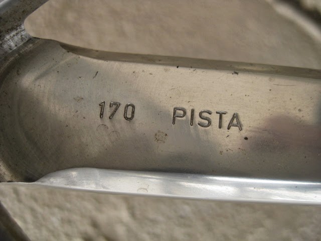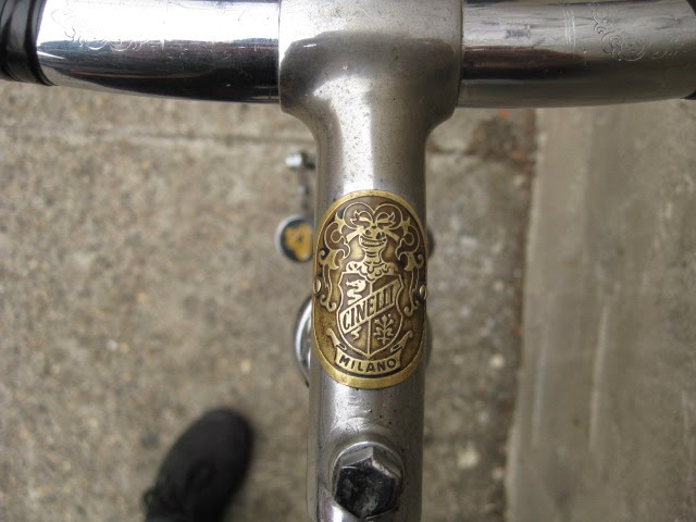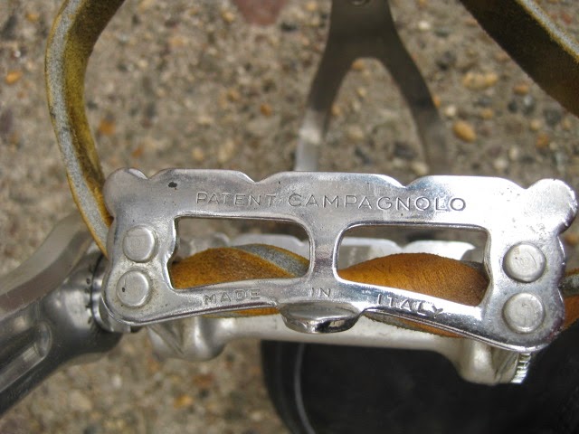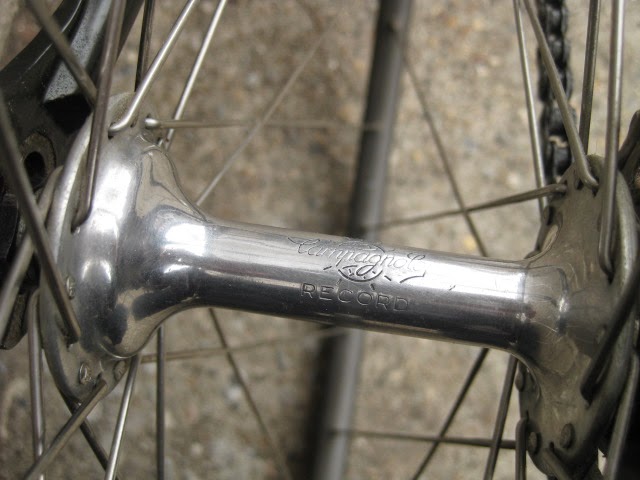 I have only made minimal changes to the set up. I changed the headset to a Campagnolo steel Pista model and the bars and stem to Cinelli model 18 steel pista bars and an older Cinelli steel badged stem. I also put new tubular tires on it. The rest of the componentry is a mixed bag of Nuovo Record and Super Record. Super Record pista cranks 170mm, Nuovo Record bottom bracket, Nuovo Record pista pedals with cyclo- cross toe clips and Alfredo Binda toe straps. Super Record seat post and Cinelli unicanitor wishbone rail saddle. Campagnolo low flange Nuovo Record pista hub set laced to NISI Moncalieri dark anodized rims. A Regina track chain rounds out the drive train.