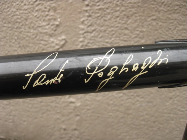 Here is another one of my personal bikes. It is a mid 1970’s Pogliaghi pista model. Here is a link to the Sante Pogliaghi section in the book The Custom Bicycle. link here! courtesy of Classic Rendezvous. I purchased it several years ago from the original owner, Scottie Hicks. He currently resides in the California Bay area and is a mechanic at The Missing Link. It was originally purchased from Hill cycle here in Philadelphia, new. Scott raced it at the Lehigh Valley Velodrome for an unknown number of years and then retired it as a training bike. He changed the fork to one that was drilled for a front brake, but provided the original fork when I bought it.