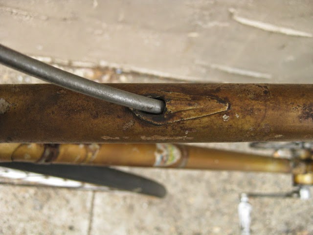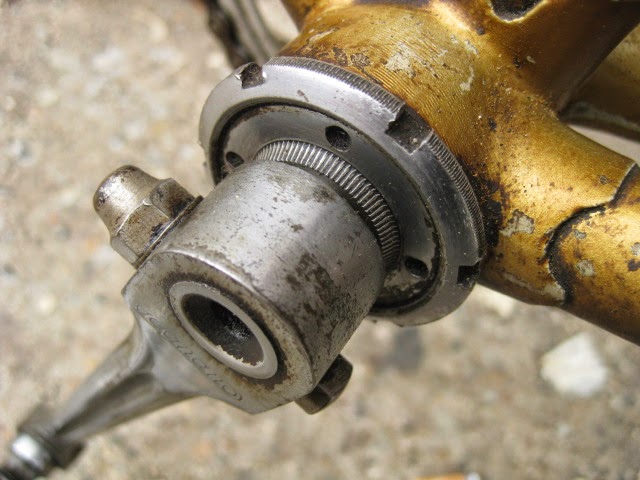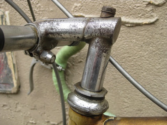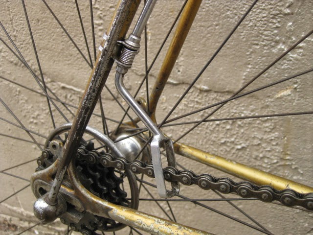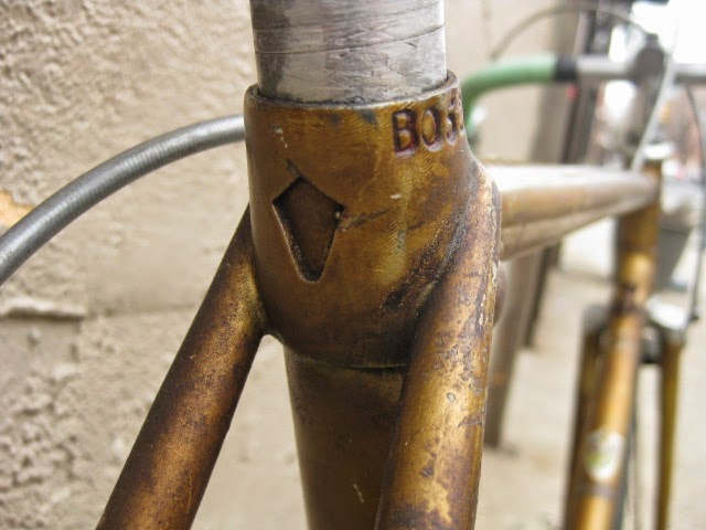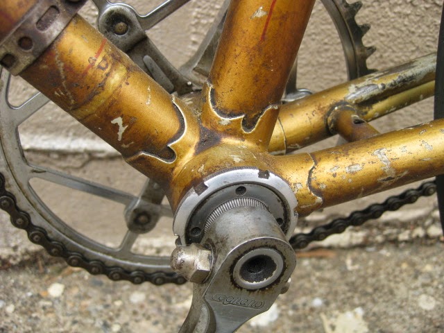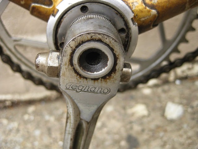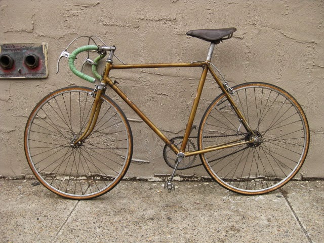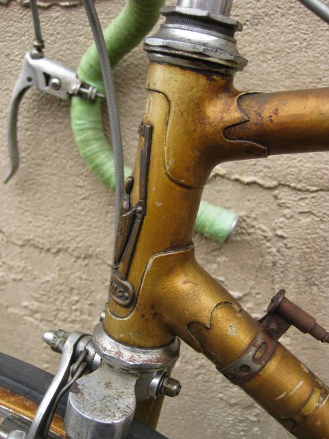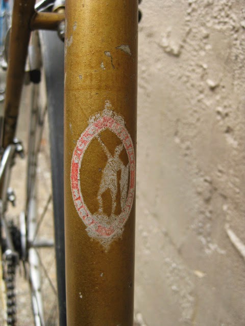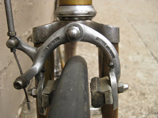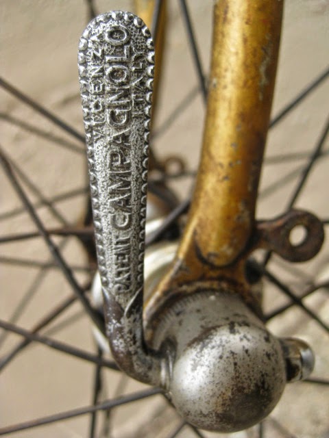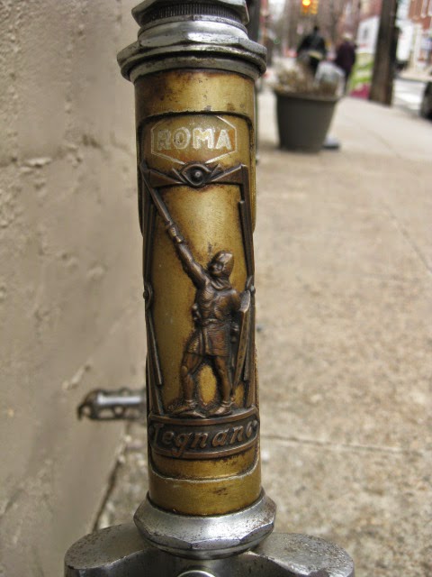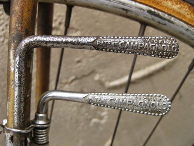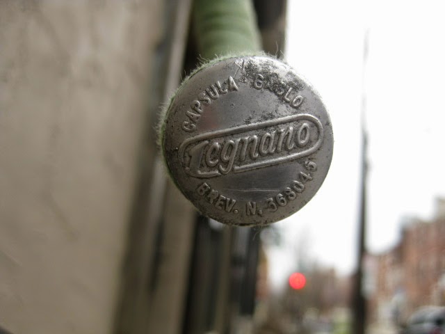 The shop got the bike several years ago in New Jersey of all places. It has original paint and decals and many of the parts are stamped Legnano. I am somewhat amazed that all the original parts have stayed with it all these years. The drive side crank is stamped Magistroni so maybe that was switched out at some point, because the non drive arm does bear the Legnano stamp. It is equipped with early Universal brakes and the unique corresponding levers with cool adjusters. Unknown bar and stem combination, Legnano stamped alloy bar plugs made by Gaslo, early dog bone skewers with the open “C” levers, and early Campagnolo hubs. Nice internal routing for the rear brake cable and housing and overall nice frame construction. the lugs have quite a bit of “shoreline” for the time, another indication of the frames high caliber. It is rare to find these bikes in such great original shape and we are happy to be its caretaker!