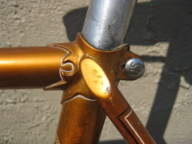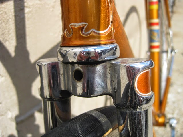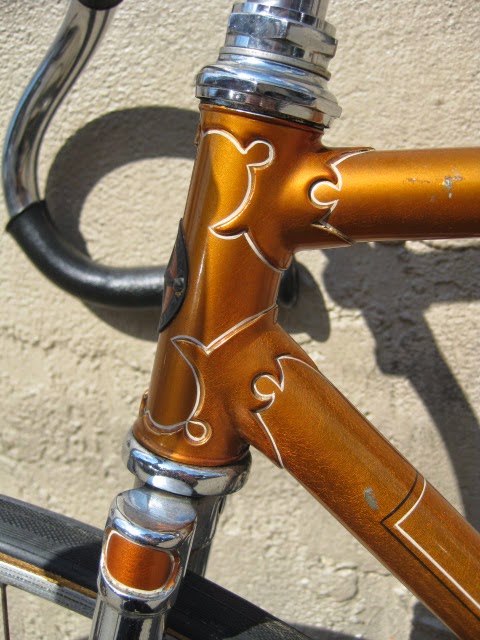 The paint color, radiant coppertone is my all time favorite Schwinn color, and somewhat of a rarity. It consists of an aluminum under coat and then the translucent orange on top, making it really sparkle in the sun. Pictures hardly do it justice. The two color box lining is superb and shows just how much attention was paid to detail on this bike. I may have forgot to mention that these aspects are all ORIGINAL to the bike! The chrome is in fantastic shape as well! It is my understanding that this bike was never really ridden and as such is a fantastic time capsule piece! It was sold out of Bergenfield, NJ which has a personal connection for me because I have some family in that area. Anyway, enjoy the photos. This is a classic American race bike!