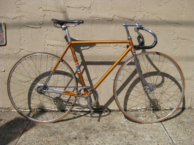 The paint color, radiant coppertone is my all time favorite Schwinn color, and somewhat of a rarity. It consists of an aluminum under coat and then the translucent orange on top, making it really sparkle in the sun. Pictures hardly do it justice. The two color box lining is superb and shows just how much attention was paid to detail on this bike. I may have forgot to mention that these aspects are all ORIGINAL to the bike! The chrome is in fantastic shape as well! It is my understanding that this bike was never really ridden and as such is a fantastic time capsule piece! It was sold out of Bergenfield, NJ which has a personal connection for me because I have some family in that area. Anyway, enjoy the photos. This is a classic American race bike!