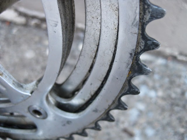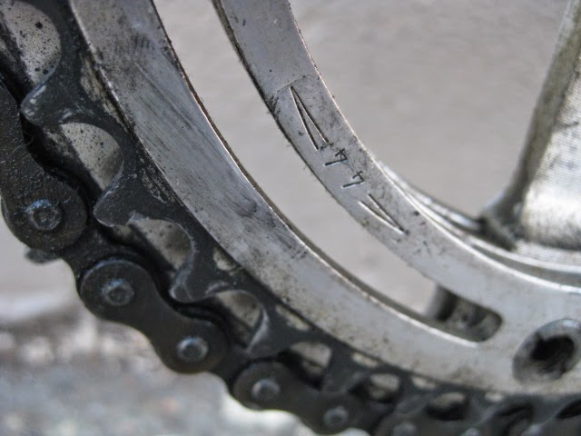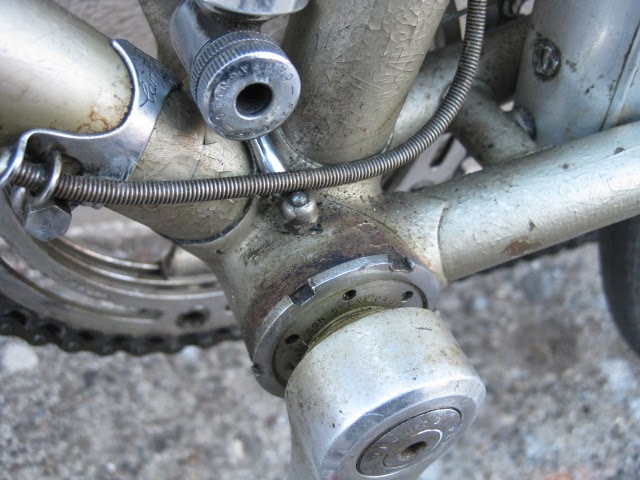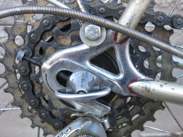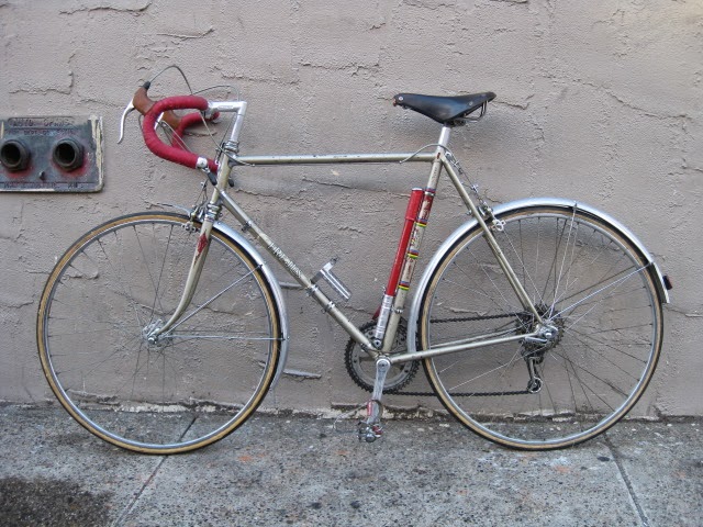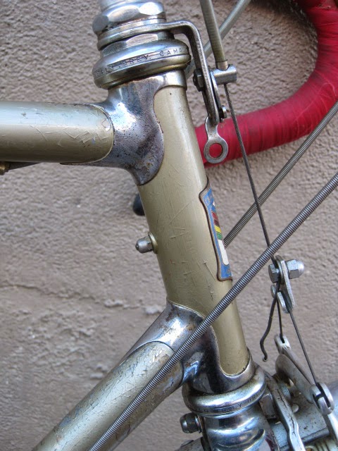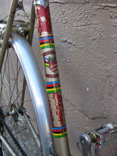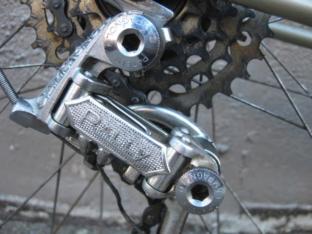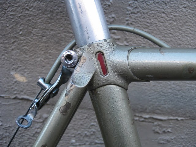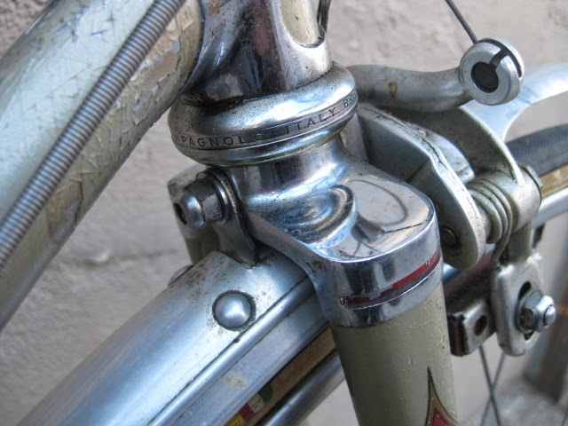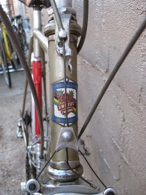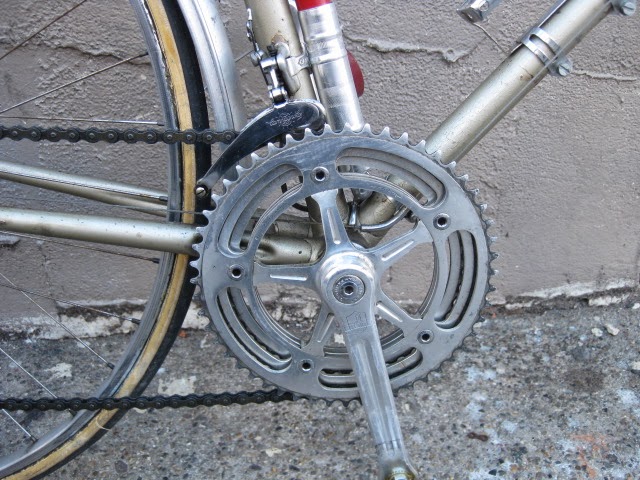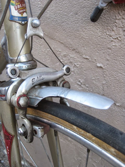 The patina on this bike is perfect in my opinion and shows it is a reliable and well ridden machine. A nice touch is the Frejus stamped alloy fenders, very sturdy and sharp looking. The bike also has a full Campagnolo Nuovo Record group with the exception of the Suntour Bar con shifters, which i like better anyway and the Balilla center pull brakes and levers. It also has the second generation Campagnolo Rally rear derailleur with the reinforcing tab which made it more substantial. Earlier versions were somewhat prone to breaking. The Rally was Campagnolo’s attempt at a touring derailleur, but also suffered the poor shifting of the Nuovo Record because it did not have the benefit of a slant parallelogram. Still, it is a classic of the era. Also of note is the Campagnolo triple crank set with half step gearing, somewhat unusual. The owner says it is among his favorite city bikes and enjoys riding it on a daily basis. Perhaps some day I will find one in my size.