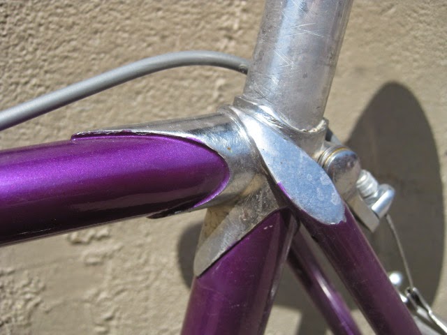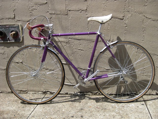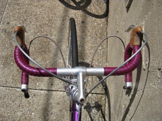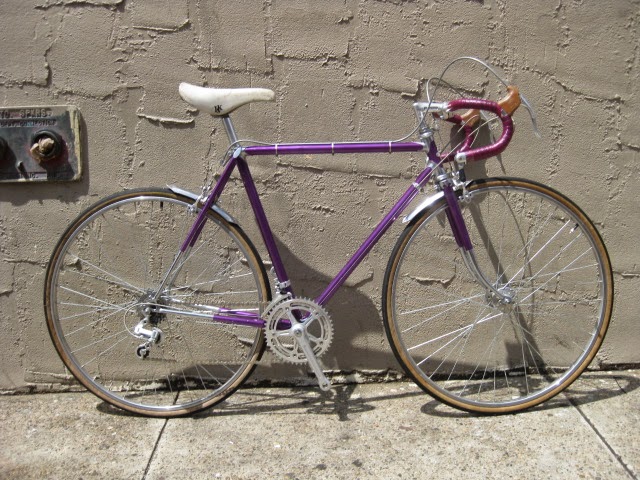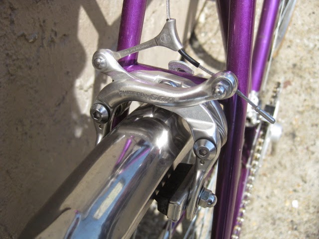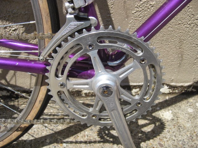 Here is another really nice road bike we recently got in. It is a mid 1970’s Centurion, higher end model. Centurion was a Japanese company that started in 1969 ish and imported bikes to the USA, mainly California at first and Texas. The earlier ones were all one color paint jobs, which this one has. It is a really magnificent purple, no decals and original head badge. Nice chromed head lugs, seat cluster, and seat stay caps. Nice flat fork crown with oval fork blades. The build is as follows: