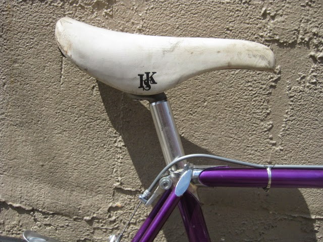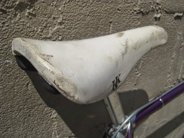 - Japanese seat post 26.8mm and scuffed white San Marco copy saddle.