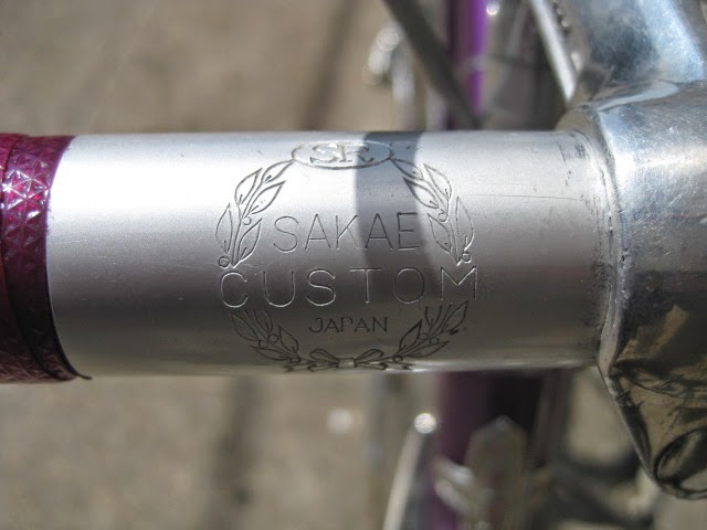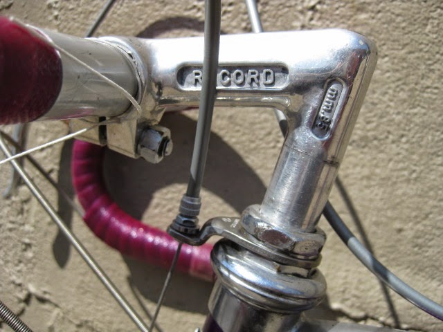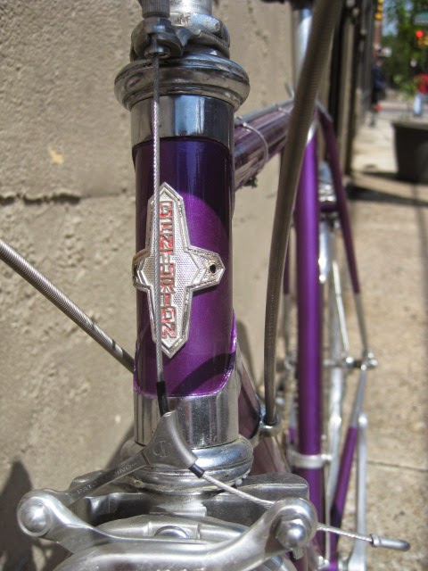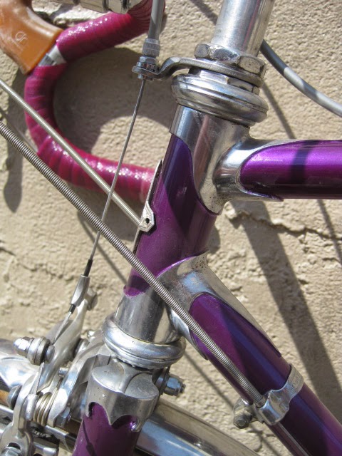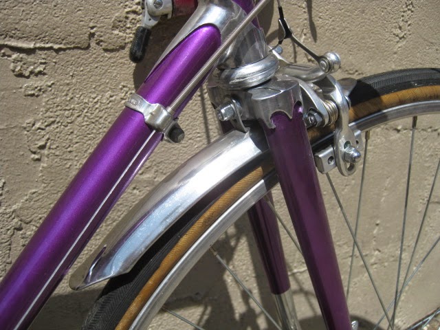 Here is another really nice road bike we recently got in. It is a mid 1970’s Centurion, higher end model. Centurion was a Japanese company that started in 1969 ish and imported bikes to the USA, mainly California at first and Texas. The earlier ones were all one color paint jobs, which this one has. It is a really magnificent purple, no decals and original head badge. Nice chromed head lugs, seat cluster, and seat stay caps. Nice flat fork crown with oval fork blades. The build is as follows: