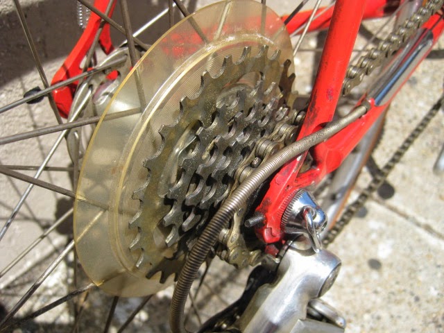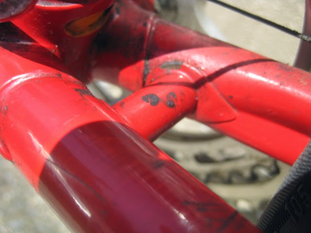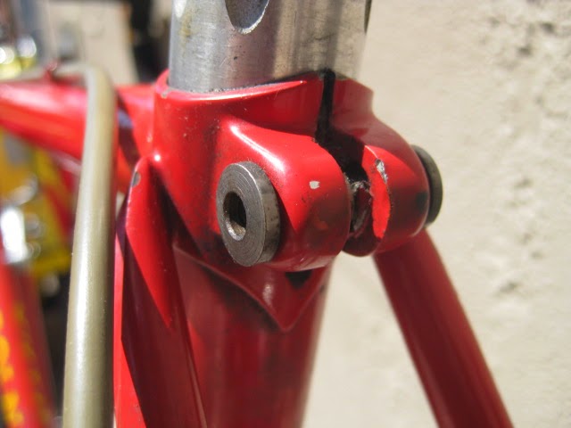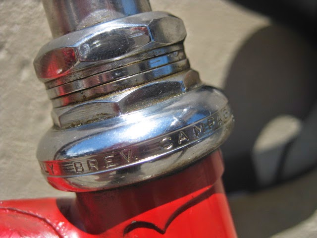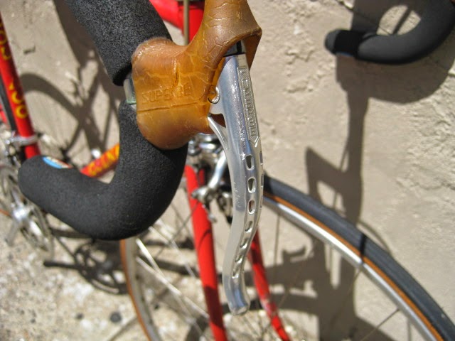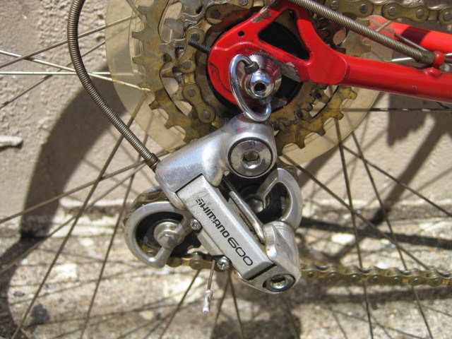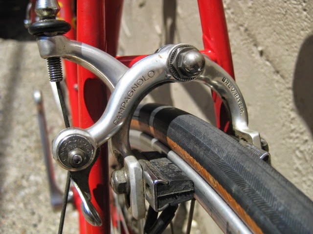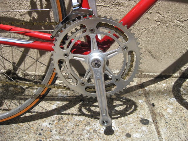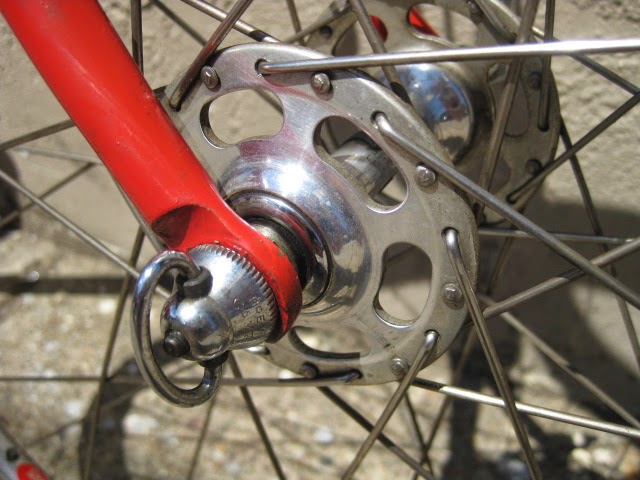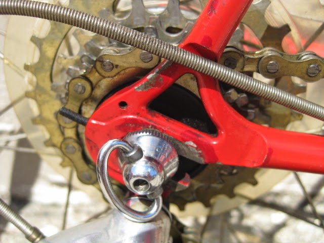 Another cool thing about this bike is that the rear drop out is drilled for the Campagnolo Porta Catena system that was offered for a short time in the late 70’s and very early 80’s. (The system is NOT on this bike currently, could be added though) Here is a link that explains the system Porta Catena! It basically was an aluminum rail that was attached to the inside of the rear drive side drop out ( Camp 1010B) which was pre drilled and tapped. It was used with a five speed freewheel and the rail took the place of the sixth cog. The shifter was also different in that it had a special release which allowed you to shift the chain onto the rail so as to facilitate very easy removal of the rear wheel. Early French Randonneur bikes also had a similar, more integrated system sometimes brazed onto the frame by top constructeurs of the day like Herse and Singer.