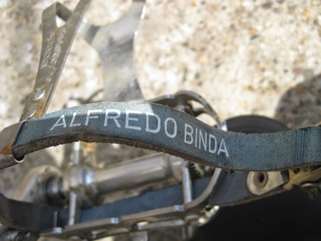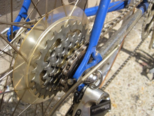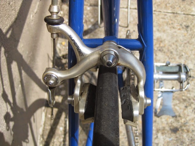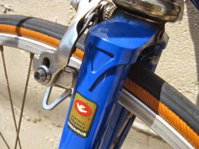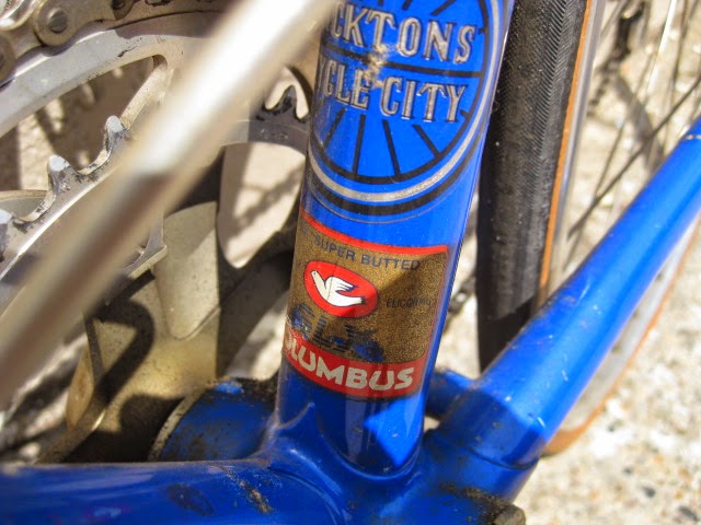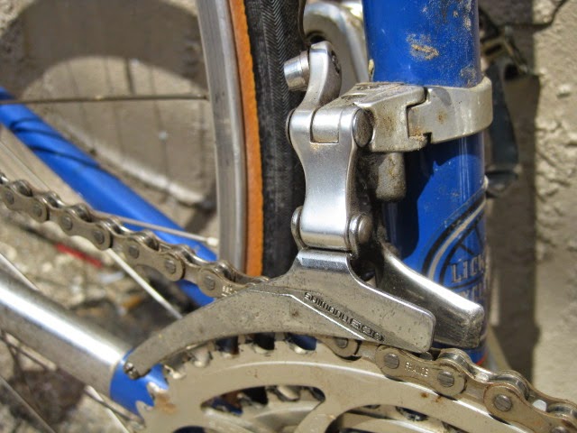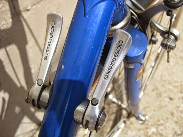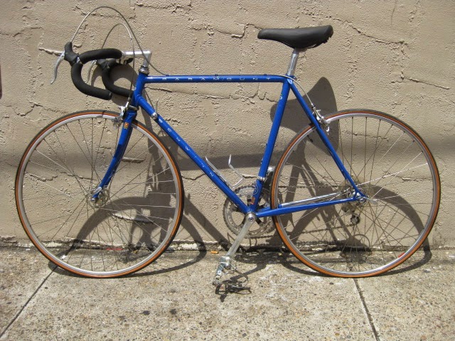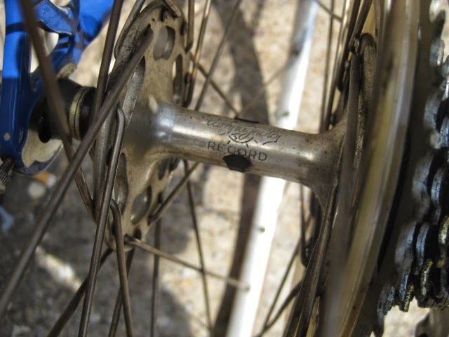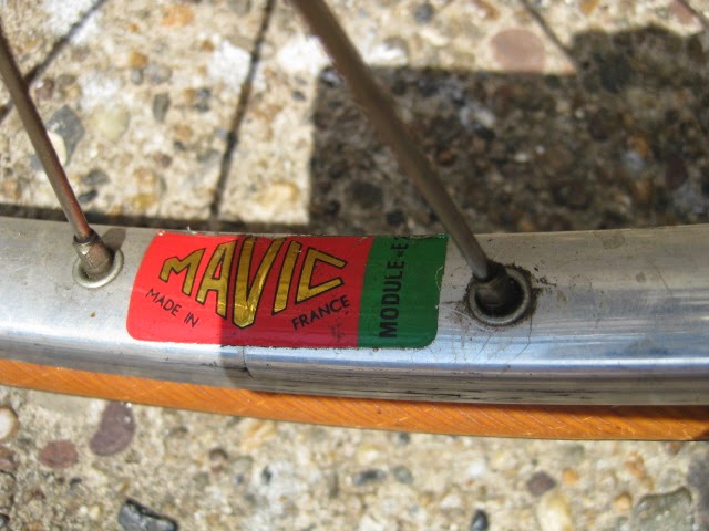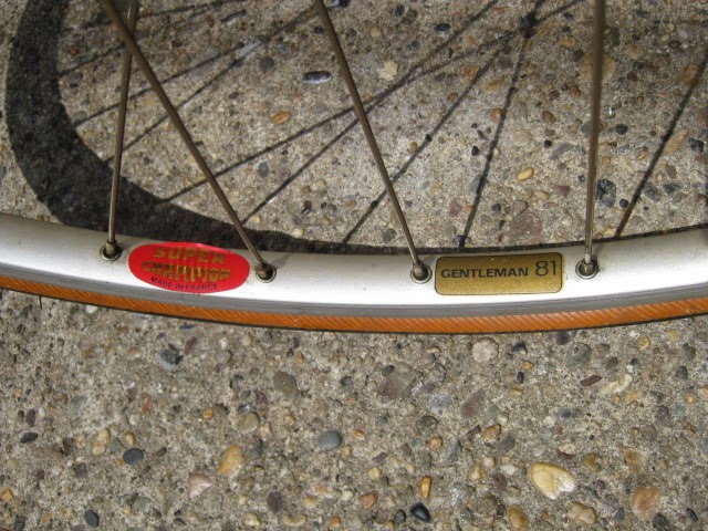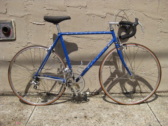 The bike has 700C clincher rims. Front is a super Champion gentleman 81, the rear is a Mavic Module “E”, Laced to Campagnolo high flange Nuovo Record hubs. Specialized 700 X 20mm tires. Tubes do not hold air and need to be replaced. 6 speed freewheel (Suntour), appears to be ultra 6 spacing. Shimano 600 front and rear derailleurs, crank set, and shifters.Suntour Superbe brake levers and calipers. Campagnolo Nuovo Record head set. SR Sakae seatpost and bar and stem combo. Stem is 100mm extension and bars are 39 CM wide CTC. Campagnolo Nuovo Record pedals with Christophe steel toe clips (large size) and blue leather Alfredo Binda toe straps. Black Burn bottle cage and foam bar tape / padding.