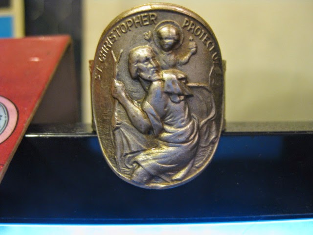 I found this item on a bike we recently acquired. It is a Saint Christopher’s medallion. Saint Christopher is the patron saint of cyclists, he protects travelers. Some say he is not a real saint and only a superstition. I guess it depends who you ask and what you believe. These were popular in some European cultures, mostly in areas in and around Northern Ireland. His image is commonly found on bells. These medallions are a bit more scarce. These were popular in the 1930’3-1950’s. The local priest would hold a “blessing of the bikes”, the medallions were made for the occasion. The medallion would be attached to the seat tube via an adjustable strap, and the bikes and their journeys would then be protected. This one is a bit newer I believe because it does not have quite the patina of the older ones I have seen. Still a pretty cool item. I will take all the help I can get when it comes to staying safe out on the road.