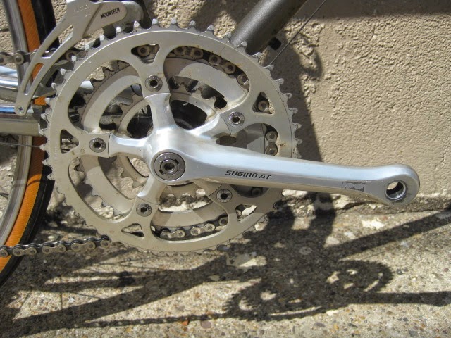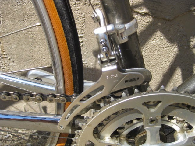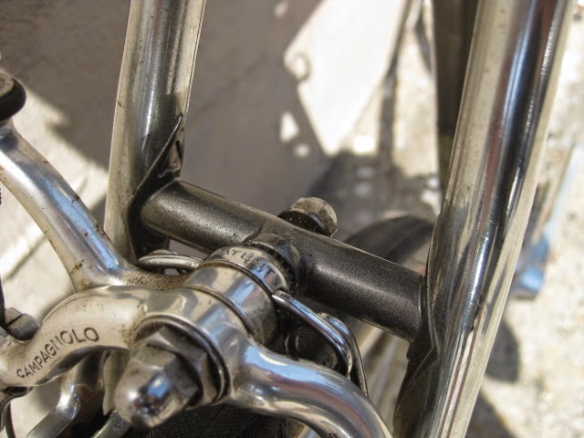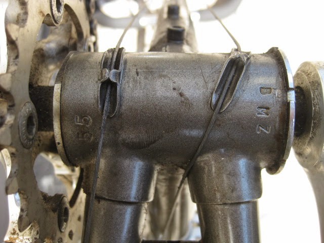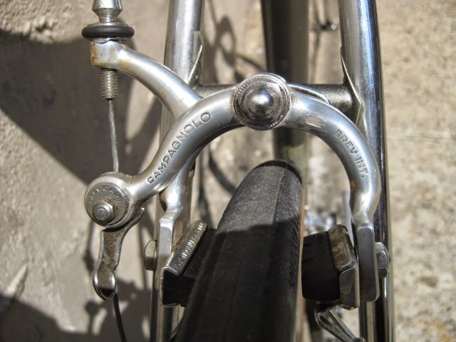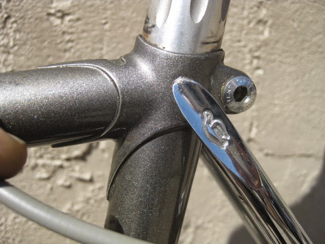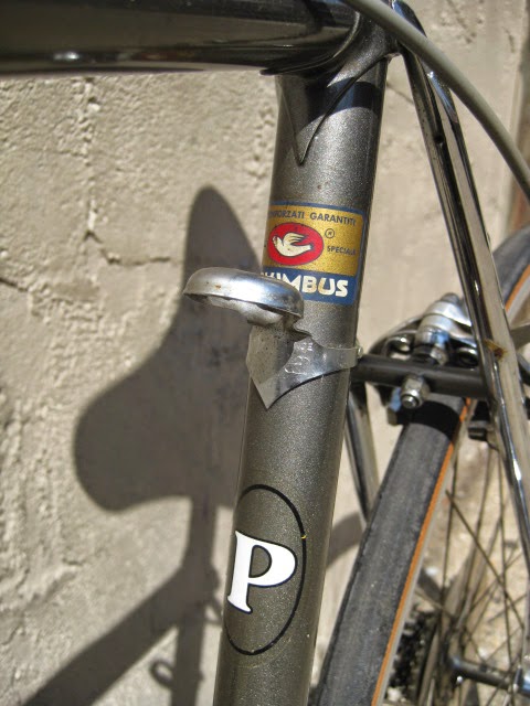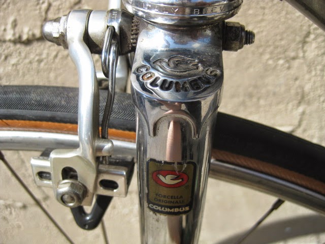 The frame is built with Columbus double butted tubing and Columbus fork blades. The Columbus logo is cast into the fork crown and the seat stay caps, a pretty unique feature I think. Campagnolo fork tips and rear drop outs, braze-ons for a rear rack (chain stays), and water bottle braze ons on top of, and beneath the down tube. finished in a nice gun metal grey. the measurements are as follows: