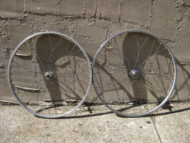 Pretty cool lacing pattern on this wheel set I found under a bunch of other wheels the other day. Laced to 26 X 1 3/8″ 590mm alloy rims. Round and true. This takes skill to pull off properly. Share this: Share on Facebook (Opens in new window) Facebook Share on X (Opens in new window) X Email a link to a friend (Opens in new window) Email Like Loading...