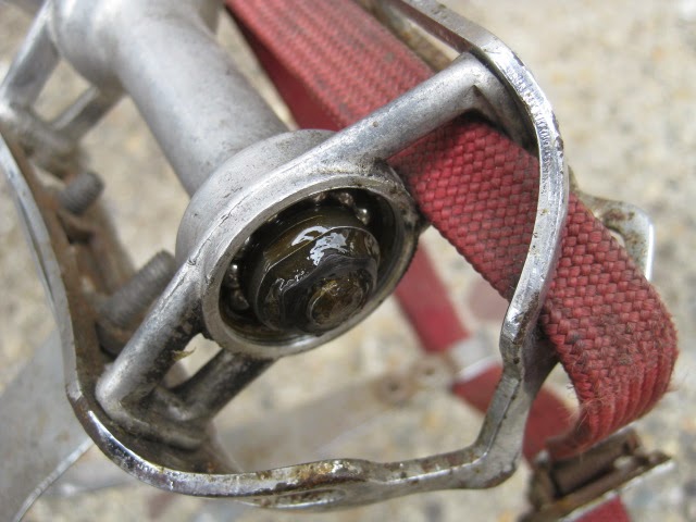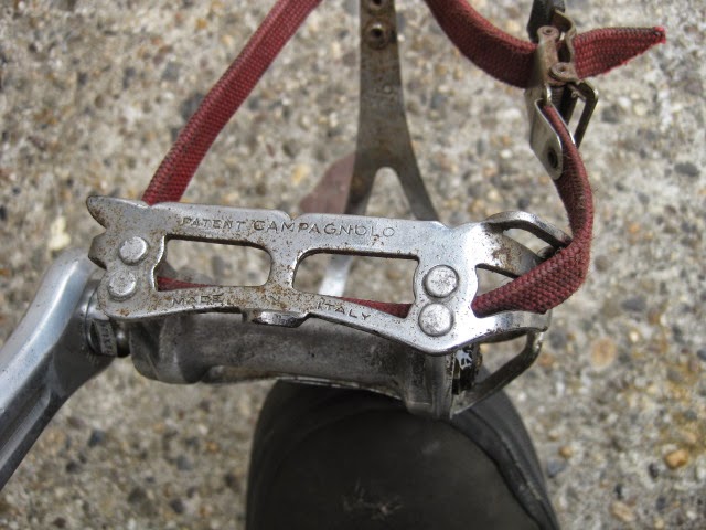 - large size steel ALE toe clips, red nylon toe straps.