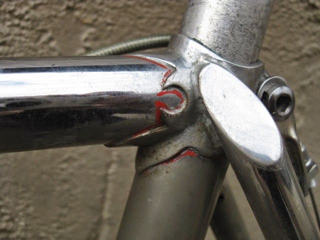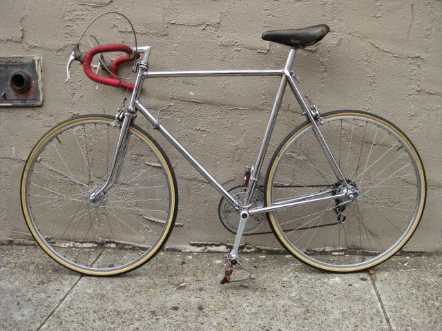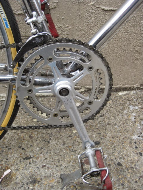 Someone needs to give this bike a good home before I do! Really awesome classic American road bike from the tail end of the second generation of the model. Full chrome plating on the frame and forks. The plating is wearing thin (dull) in certain areas on the frame, tough to photograph, mainly the seat cluster / top of the seat tube and seat stays. Original Schwinn Paramount head badge. Red lug lining, no decals. Serial number is Y39 which dates it to the tail end of 1965. Seat tube is 60CM center to center. Top tube is 59CM center to center. Stand over height is 34″ (with air in the tires). Frame has eyelets brazed on at the drop outs (common at this time), cable stops for the rear brake cable, and cable stop for the rear derailleur housing.