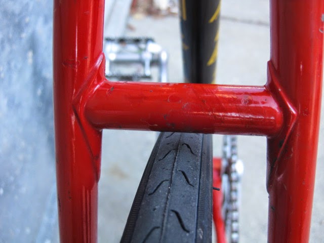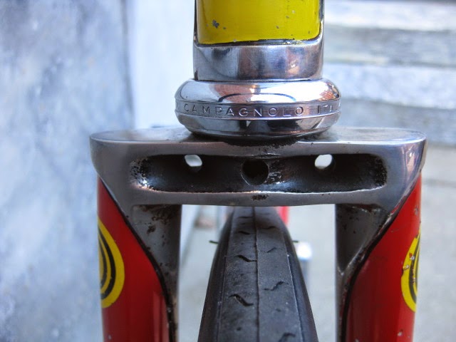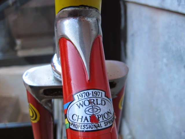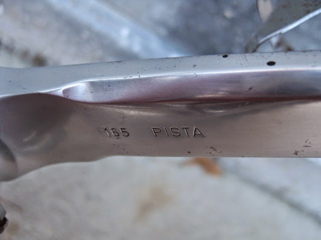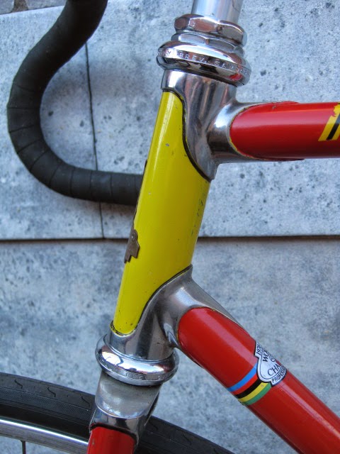 These are some of my favorite pista bikes. I always loved the fork crown and the drilled rear drop outs. Great color scheme as well. The head lugs are nicely filed with long thin points and the BB shell has the nice long reinforcing tangs. I believe this is built with Reynolds 531 tubing as 753 was not available untill 76′ and it takes a 27.2 seat post and most older 753 tube sets used 27.4. Plus it feels heavy like a 531 built frame. Overall great machine and great owner. Happy to help out!