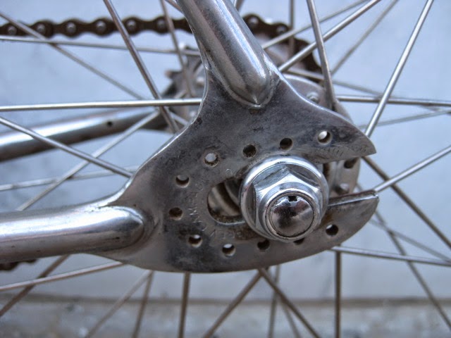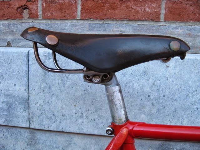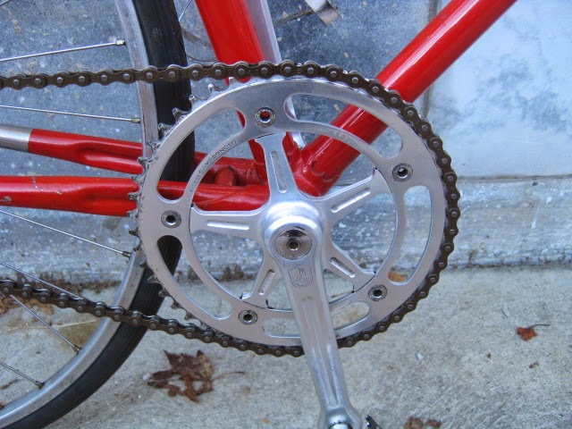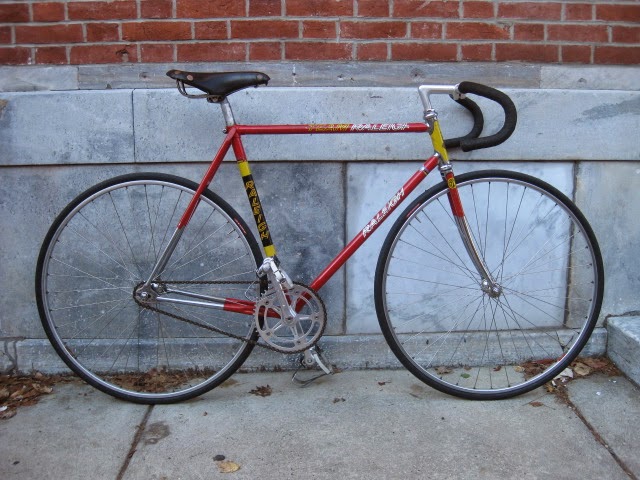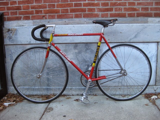 We have been getting to work on some awesome bikes here at the shop recently. This one takes the cake. A friend and customer of ours recently purchased this 1975 Team Raleigh pista frame and fork. He brought it to us for the rest of the build. I was able to obtain the necessary parts at a couple of recent swap meets. It is built with Campagnolo Nuovo Record pista cranks and bottom bracket, low flange Campagnolo pista hubs laced to Mavic Module E 700C clincher rims. Brooks pro saddle and Campagnolo Nuovo Record seat post. The frame and fork came with the Campagnolo Nuovo Record head set. It also sports an alloy Cinelli 1A stem and Cinelli Criterium bars. MKS black cage “con denti” pedals with Christophe toe clips and white leather toe straps.