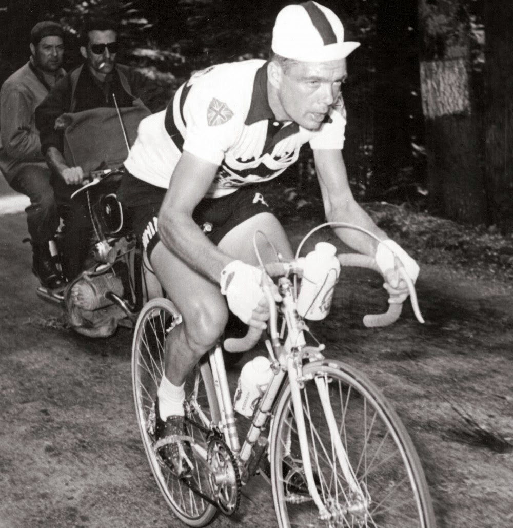 I first noticed the Mafac Competition brakes, that were a product of the mid 1960s, and examining the photo of Brian Robinson riding, one can see they appear to be Mafac Dural Forged brakes. I also noticed the Campagnolo headset is a mix of various models- the adjustable cup is 1960s-1970s Gran Sport, whereas the lower cup is Record/Nuovo Record. I won’t be as critical to comment on cable ferrules or cable end caps. . .