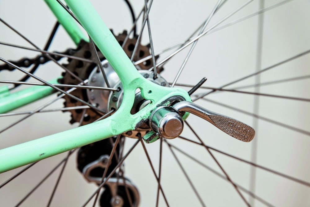 With regard to the bike itself, it's a pretty thing, but there is precious little (if any) period-correct 1959 anything on it. The handlebar taping around the brake levers is awful, and 2X spoking is just plain wrong.