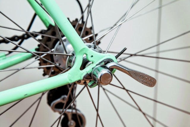 The photo, with the caption “Tullio Campagnolo invented the quick release back in 1930, and they’ve changed little since,” shows a 1990s-2000s SHIMANO quick release skewer.