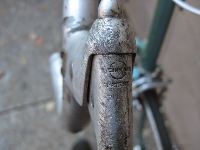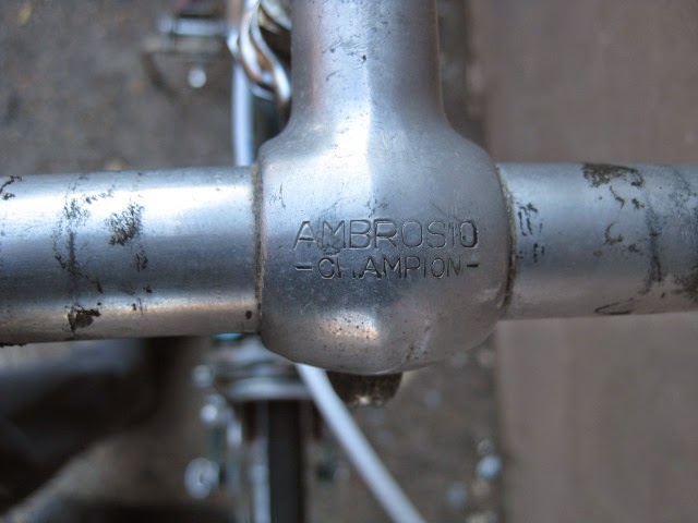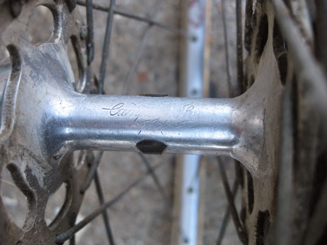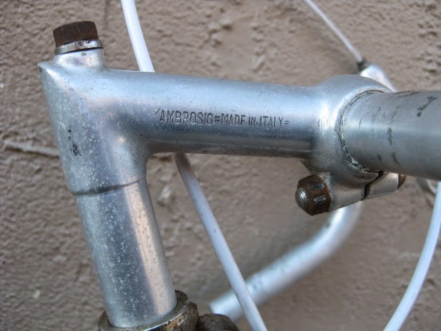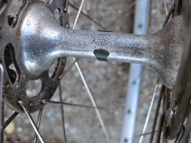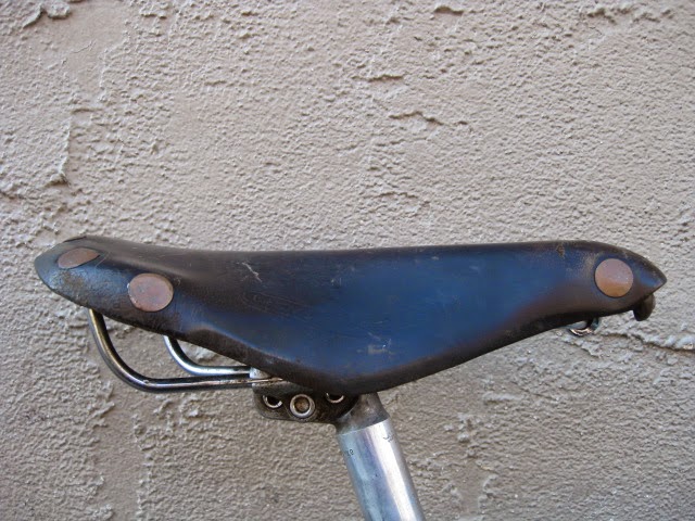 Offered for sale today is a 1959′ ish Schwinn Paramount road bike. Serial number B72 according to Waterford’s site puts production in the area of fall 1959. This is the second number system Schwinn used from 1959-1965. The bike is built with a mostly a later Campagnolo Nuovo Record component group. The hubs are Campagnolo HF “no record” laced to unknown tubular (sew-up) rims, tires are bad and need to be replaced. Campagnolo NR rear derailleur pat. 73 stamp. Campagnolo NR front derailleur. Campagnolo DT clamp on shifters and cable guide. Stronglight 49D cranks with Stronglight BB as well (52-42 chain ring combo). universal mod.61 brakes and scuffed up Weinmann red dot brake levers. Ambrosio Champion road stem (95mm extension). Clamp pinch bolt is seized, hence the odd bar position. unknown alloy bars, 38 CM wide CTC. campagnolo NR seat post (27.2) with Brooks Pro saddle, dark brown, large rivets, in good condition. Lyotard touring pedals with XL steel toe clips (Christophe Special).Unknown headset, perhaps Stronglight. Campagnolo pump head without safety circle.