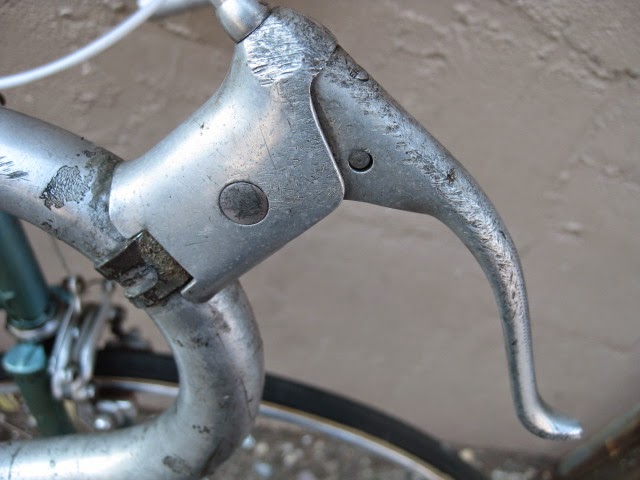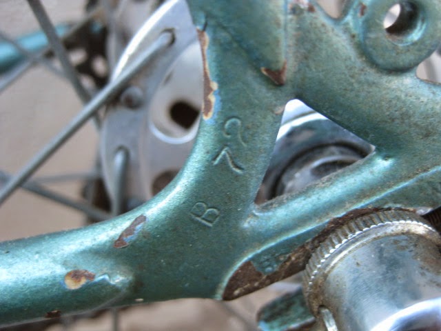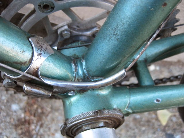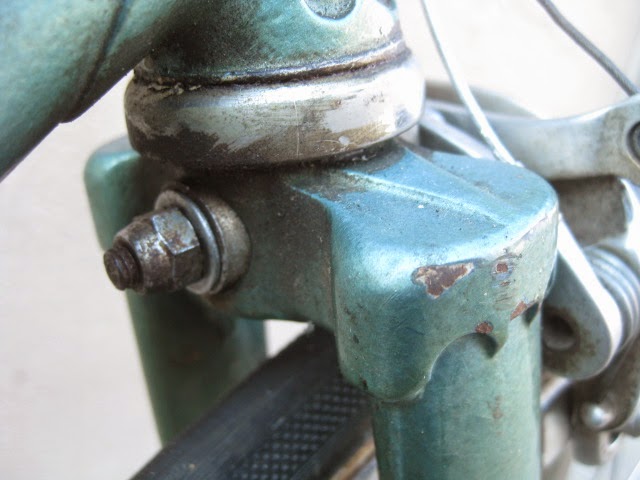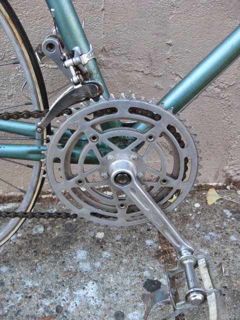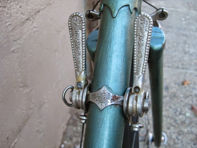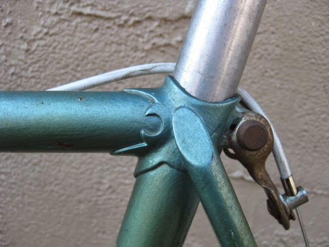 - The frame has been re-painted and has no decals. Paint color is a faded teal green. no headbadge either. Campagnolo drop outs with eyelets.