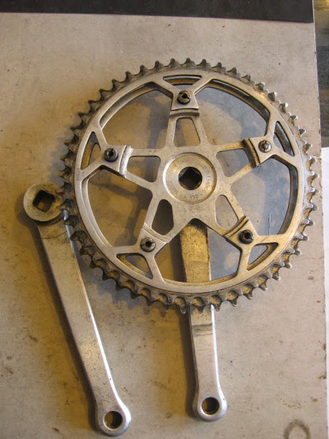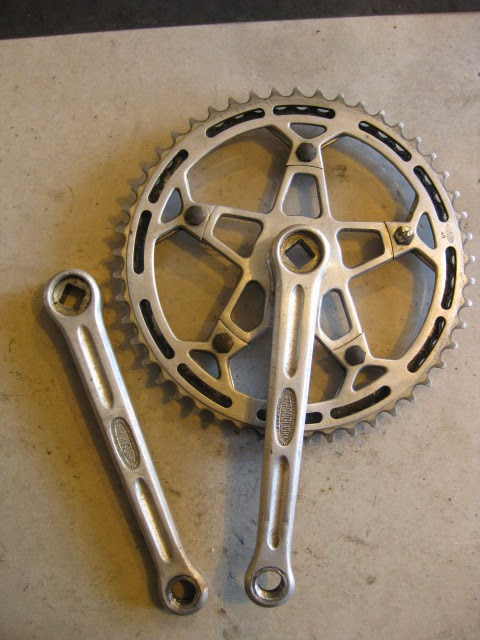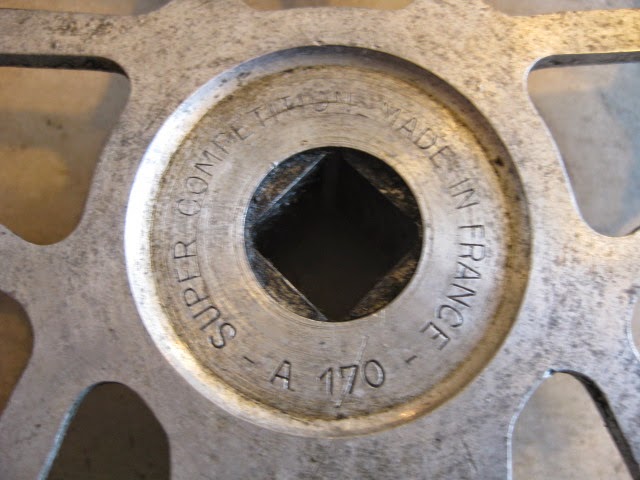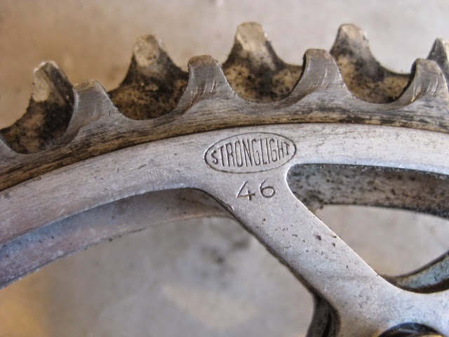 One of my favorite crank sets offered for sale today. It is a Stronglight 57 Super Competition, which was introduced in 1957. It uses a 122mm BCD as opposed to the 49D BCD of 50.4mm. The spider is cast as part part of the crank itself in the now standard “star” pattern. This set has English pedal threads and utilizes a half step chain ring combo of 49 / 46T. the arms are 170mm long. This will polish up beautifully. Don’t miss out on this opportunity to own a classic of the era!