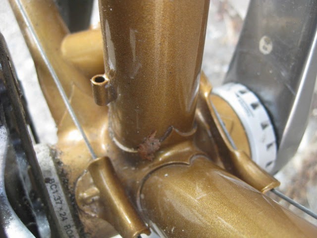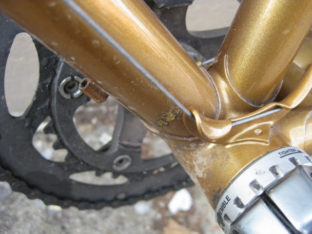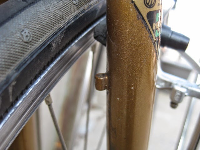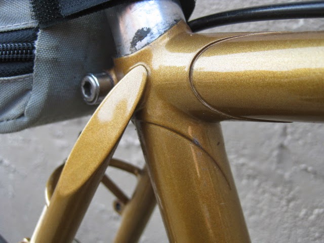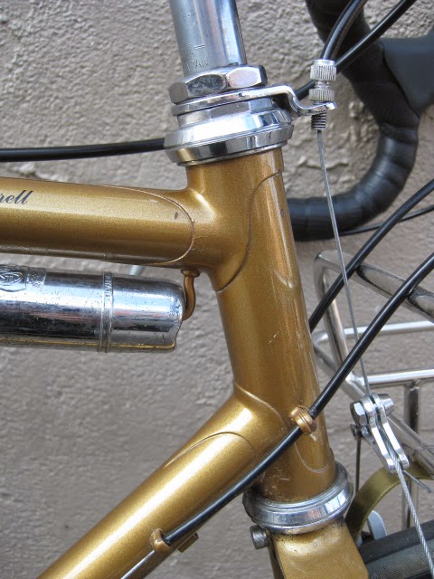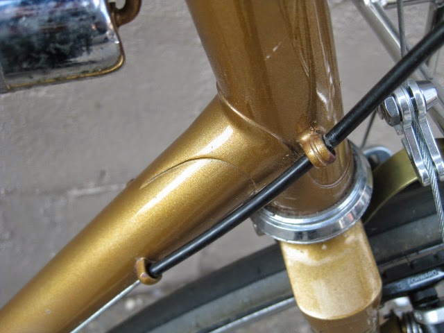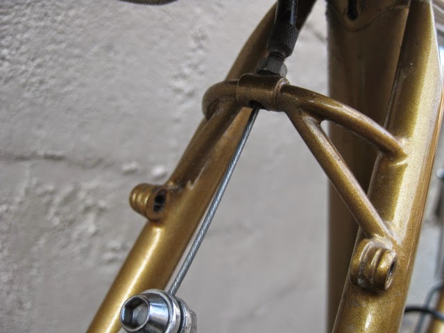 The construction is top notch, all the lugs are thinned out with nice crisp and long points. Lots of braze-ons for racks and fenders and very nice lighting wire guides front to back. One unique feature is the oversize chain stay bridge behind the BB shell. It is threaded for fender mounting, I am not sure of the advantage. Maybe to stiffen up the area around the BB shell to make the tail end less “whippy”? The back of the fork crown is threaded as well for attaching fenders, a nice touch. The paint is nice and thin revealing any mistakes, and there are none. Very clean brazing. the other unique feature is the reinforced rear brake cable stop, a design I have never seen before, but makes perfect sense.