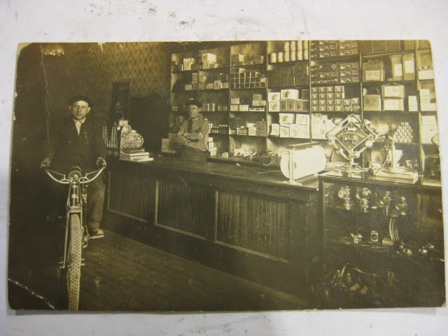 This is an old post card, and on the front is a really cool old bike shop. I am not sure of the exact age, but it is at least 1892. I say that because there is a candle stick telephone on the counter, and those were first available in 1892-3. Note the awesome New Departure bell display next to the phone on the counter. Also of note are the carbide lamps in the display case. That may be an early’ish motorcycle the man is sitting on, I am not sure though.