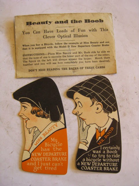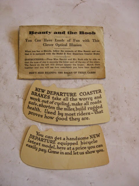 Sorry for the lack of posts this past week. I was home sick with the flu from hell. Toddler germs are lethal! This is a pretty cool little trinket / promo item from New Departure. Beauty and the Boob, kind of like getting a treat in a Cracker Jack box. I like this idea. It is advertising the Model D hubs, so that dates it. Original in the package (envelope). These are rare as they are paper and easily destroyed or discarded. Enjoy.