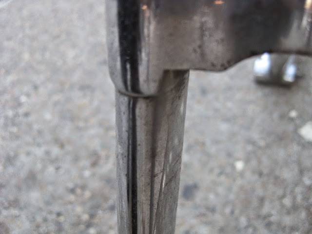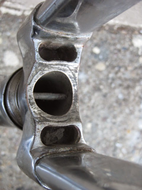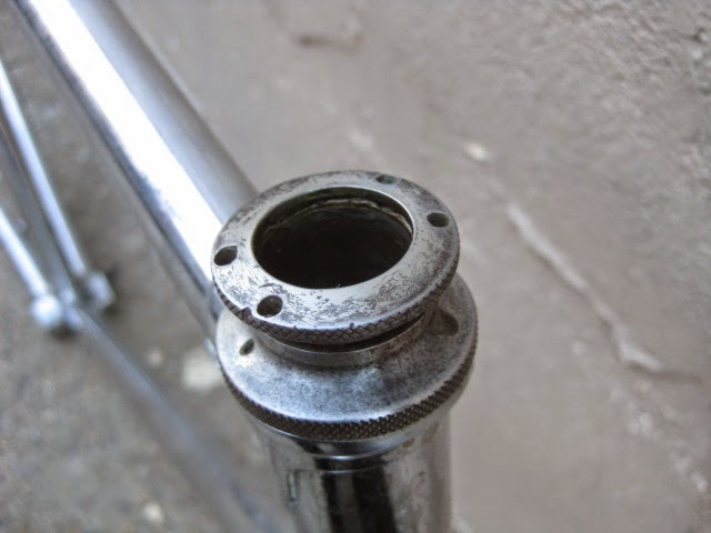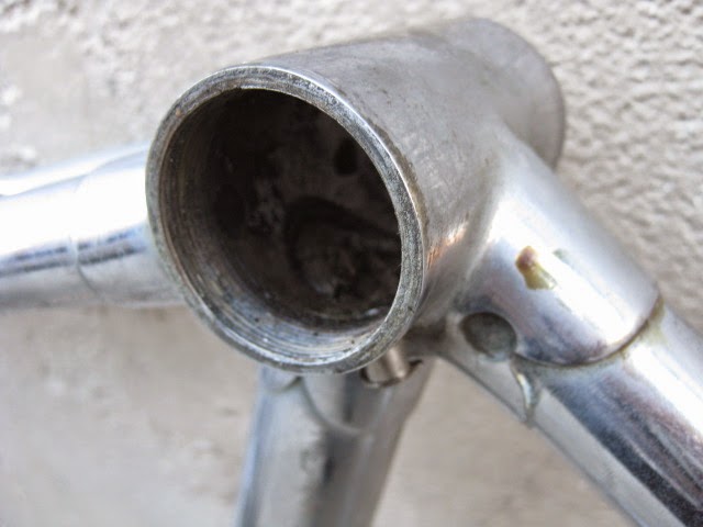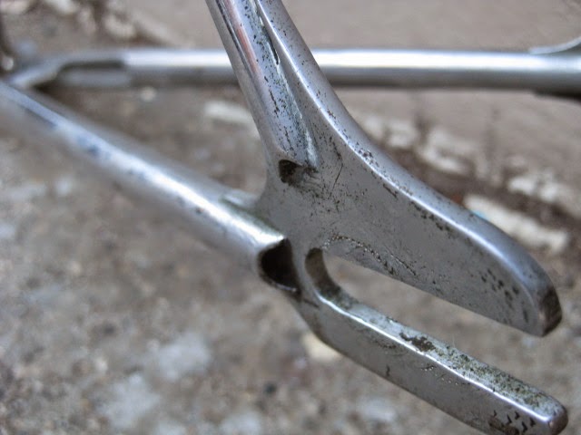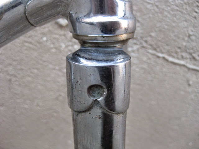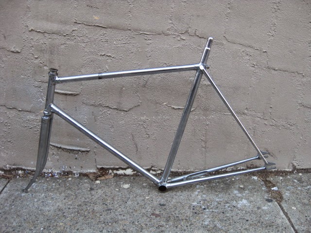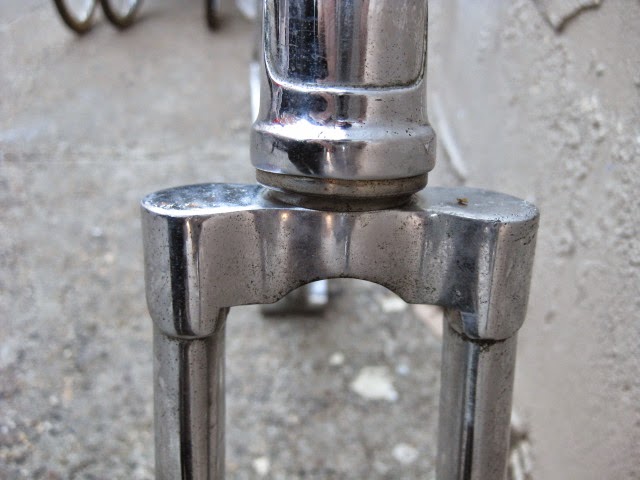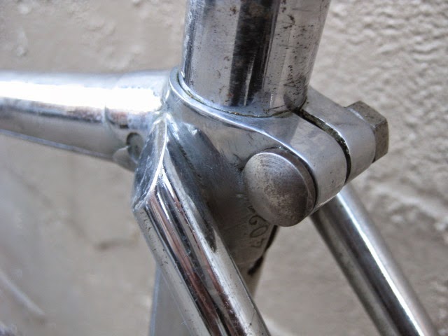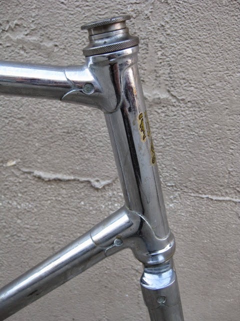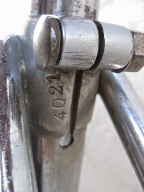 This is a really nice, original chrome plating track frame fork we got not too long ago. I was told by the previous owner that it is a BSA, but I am not 100% sure. The only mark it has on it is the serial number #4021 stamped on the back of the seat lug and the drive side drop out. There is a BSA decal on the head tube, but it is not original. I believe they are letters bought at a hardware store or something and applied a long time ago, they are old. The chrome plating is original and in fantastic condition for its age. Very little if any at all peppering. Also included is the original BSA head set, which has integrated type cups and would be difficult to source. It feels very good for its age, could use an overhaul. The head tube and seat tube angles are very relaxed, more like a path racer type bike except the fork crown is not drilled for a brake and the rear brake bridge is very dainty (thin) and could not even be drilled safely to accept a rear brake. It has nice keyhole type lugs (BSA, perhaps) which have been thinned out some. The BB shell has a zirc (oiler) fitting and is English threaded. The ends of the seat stays at the drop outs are uncapped. The fork blades are “D” shaped and not round. Rear spacig is 115mm and front spacing is 100mm. Frame and fork are in alignment. No dents or dings, very well cared for. Requires a 26.8 seat post, which will be included as well (original to the bike).