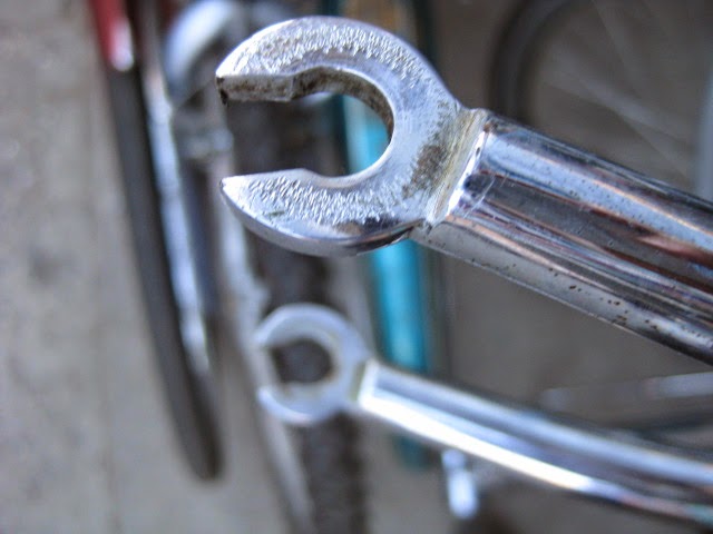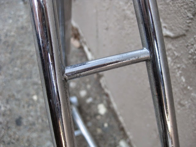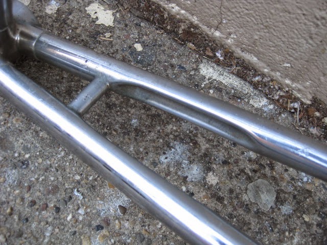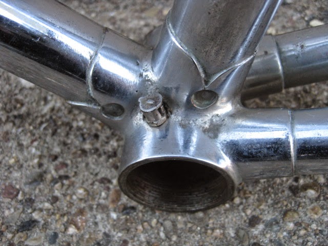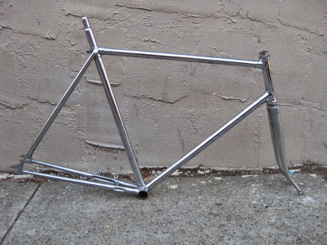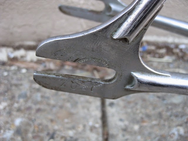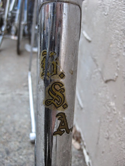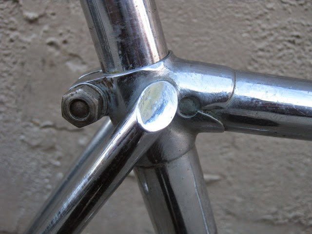 This is a really nice, original chrome plating track frame fork we got not too long ago. I was told by the previous owner that it is a BSA, but I am not 100% sure. The only mark it has on it is the serial number #4021 stamped on the back of the seat lug and the drive side drop out. There is a BSA decal on the head tube, but it is not original. I believe they are letters bought at a hardware store or something and applied a long time ago, they are old. The chrome plating is original and in fantastic condition for its age. Very little if any at all peppering. Also included is the original BSA head set, which has integrated type cups and would be difficult to source. It feels very good for its age, could use an overhaul. The head tube and seat tube angles are very relaxed, more like a path racer type bike except the fork crown is not drilled for a brake and the rear brake bridge is very dainty (thin) and could not even be drilled safely to accept a rear brake. It has nice keyhole type lugs (BSA, perhaps) which have been thinned out some. The BB shell has a zirc (oiler) fitting and is English threaded. The ends of the seat stays at the drop outs are uncapped. The fork blades are “D” shaped and not round. Rear spacig is 115mm and front spacing is 100mm. Frame and fork are in alignment. No dents or dings, very well cared for. Requires a 26.8 seat post, which will be included as well (original to the bike).