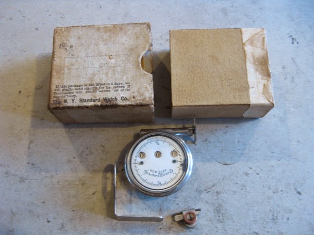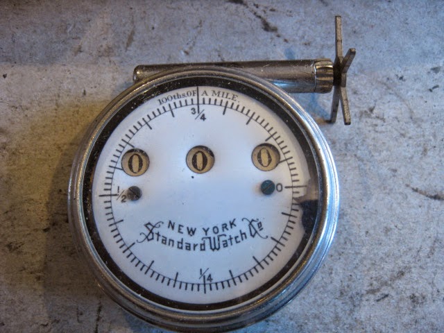 This is a rare piece. N.Y. Standard Watch Company cyclometer, NOS NEW in the box. This one is for a 28″ wheel. Circa 1900 production. Functions perfectly and comes with original mounting bracket and wheel striker. Box is in great shape for its age. Excellent finishing touch for your period restoration.