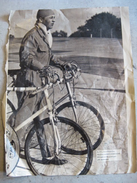 I am not sure what magazine the above photos are from, but it is Jose Meiffret with a pair of his bikes. He famously carried the above mentioned note in his jersey pocket on one of his motor paced record attempts.