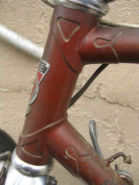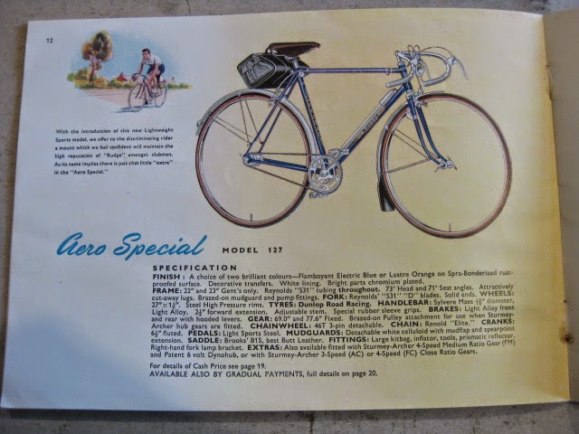 This is a nice Rudge Aero Clubman from the 1950’s offered for sale today. Here is a link to the Retro Raleigh page about the rise of the Clubman style bike in Great Britain. CLUBMAN! This bike is set up a bit differently than original, but still a clean example worthy of restoration. It currently utilizes front and rear derailleurs. Originally it would have had a Sturmey Archer internal rear hub gear and single front chain ring, somewhat a British tradition. Derailleurs were more of a continental European thing. This could also have been imported to the USA and set up like this here. The motto of the era in England was “export or die” post war time. The cranks are also French threaded, and I assume French in origin. The pedals are Atom 700 and are threaded appropriately. These are things I will leave up to the buyer to decide how to set up / change. Original decals are all there, some in better shape than others.