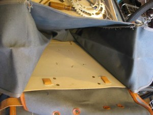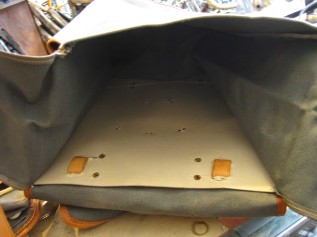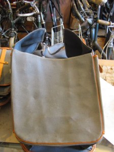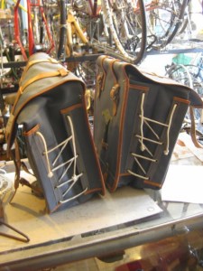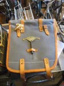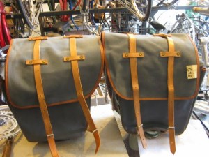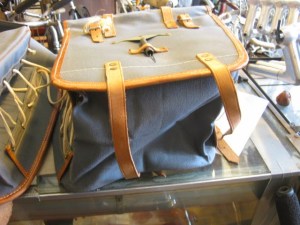 Here is a very rare item offered for sale today. it is a pair of AC Sologne panniers in NOS condition. Almost impossible to find in this condition. These are the type B bag I believe. AC Sologne bags were made in France and were top quality. Gilles Berthoud bought the company name many years ago and continues to make bags with some of these patterns today. These originals are highly sought after today and complete that period French cyclo-tourist bike nicely. These are from the late 60’s-1970’s. They are made from a nice bluish cotton canvas with leather trim and buckles. They work with most racks.The sides are laced (expandable), a nice feature to get a nice snug fit on your luggage.