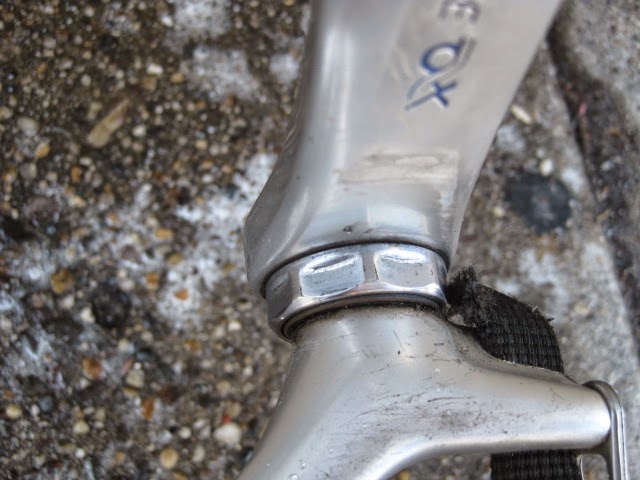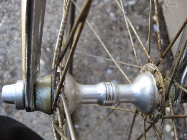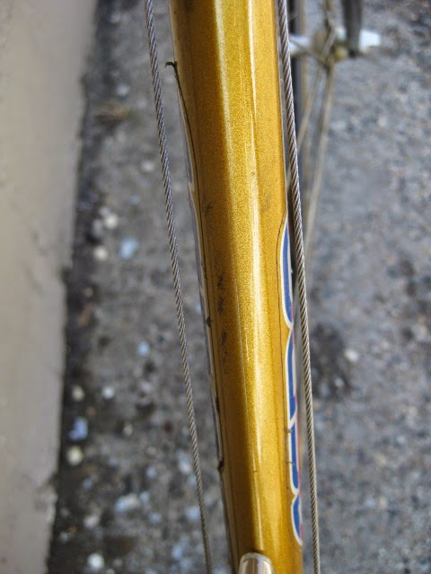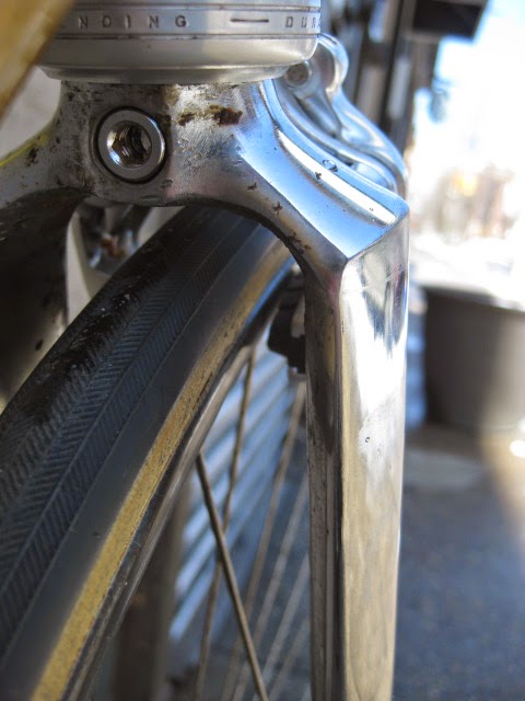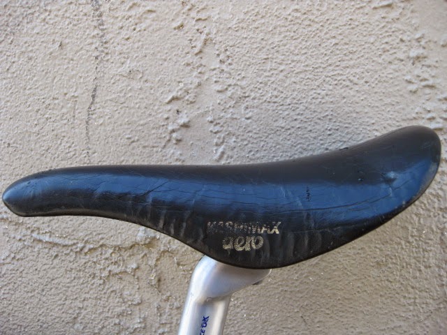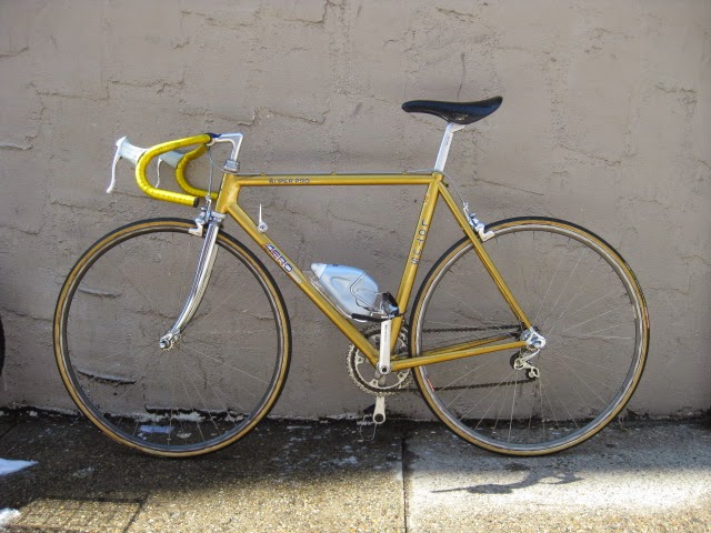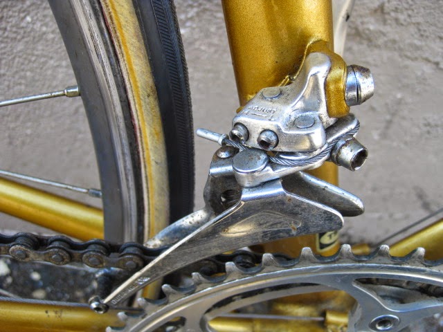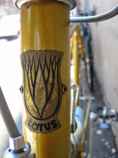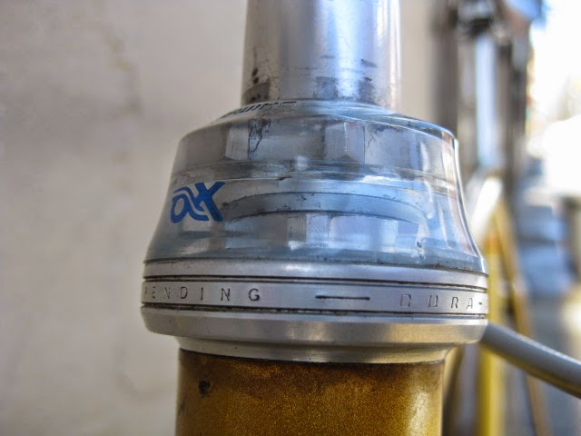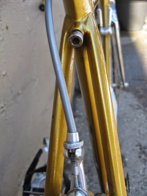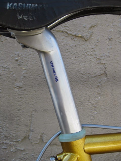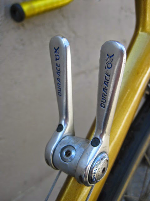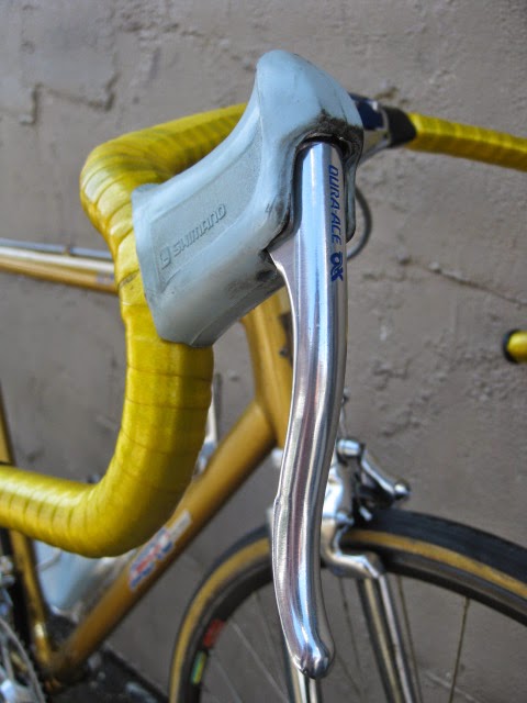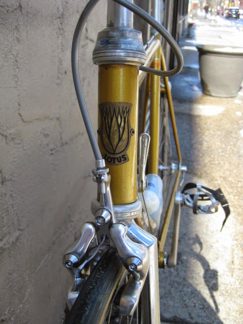 Sorry for the lack of posts in the past week. I was very busy boxing and shipping out larger internet sale items and also was ill. But, enough about me. This is a really unique bike one of our loyal customers / friend brought in for us to assemble / tune up. It is a 1981 Lotus Aero Super Pro frame and fork complete with the spec’d Shimano AX Dura-Ace component group that he sourced. It is a fine original example, probably the nicest I have ever seen in person. Here is an article about the model’s history and specs. Lotus Aero Super Pro! Thanks so much for trusting us with its care! This design was pretty cutting edge for the time and was a bold move for such a young company. It was also featured in the July 1982 issue of Popular Mechanics Magazine! My favorite detail is the aerodynamic brake caliper barrel adjusters, no detail spared in the pursuit of streamlined advantage! Not too long after this, Campagnolo famously introduced its C-Record groups in 1986 complete with the iconic Delta brakes and sculpted components. Enjoy the photos!