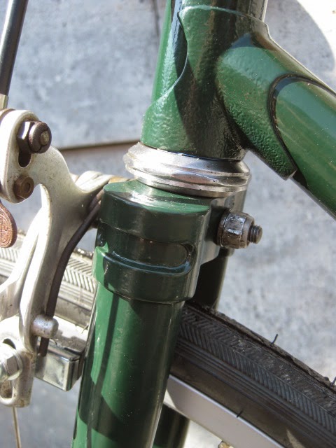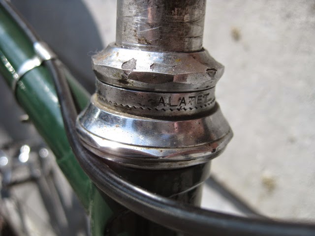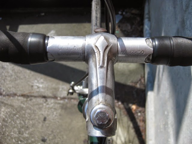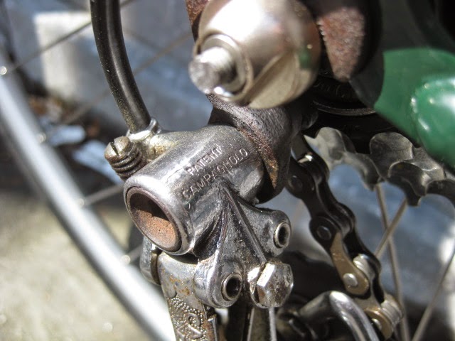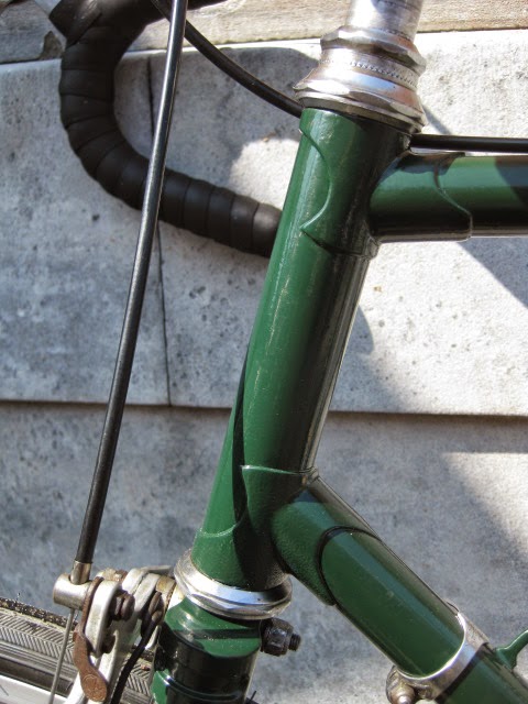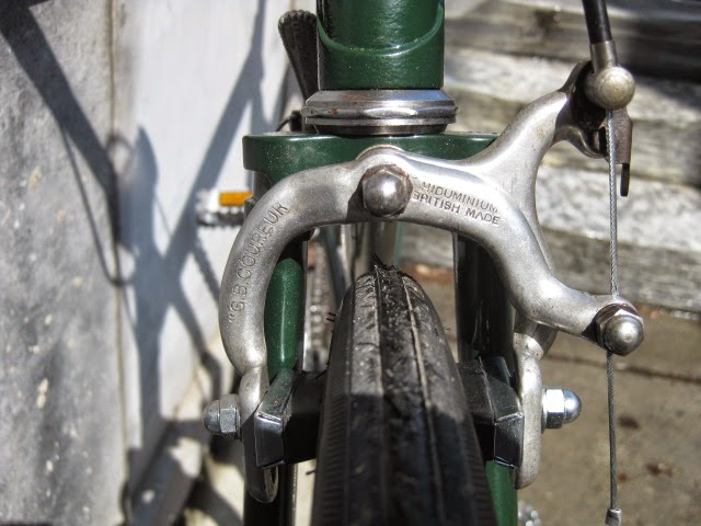 We used the original Campagnolo Record rear derailleur and shifter (shifter is closed “C” , so it is newer). It also has the original Brampton Alatet head set. We had to get a custom BB made for it as it took the oversize Chater Lea type (Whitworth threaded). The customer wanted to use more modern (cotterless) cranks. Our solution was to use a Shimano cartridge bearing BB spindle of appropriate length and bearings, and have oversize Whitworth threaded BB cups and a spacer sleeve made. The solution, after a bit of tinkering, worked like a charm, buttery smooth and tight. So, the bike retains the original threading in the BB shell with a more modern cartridge bearing assembly and cotterless crank set. it has modern alloy wheels (27″ double wall machined sidewall rims). it also has the original bar and stem, GB Maes (sleeved) bars with really cool stem of unknown make. It also has the original GB Hiduminium brake calipers with modern pads.Unfortunately, the paint is a bit thick on the underside of the BB shell, obscuring some serial numbers / factory codes. (see photos).