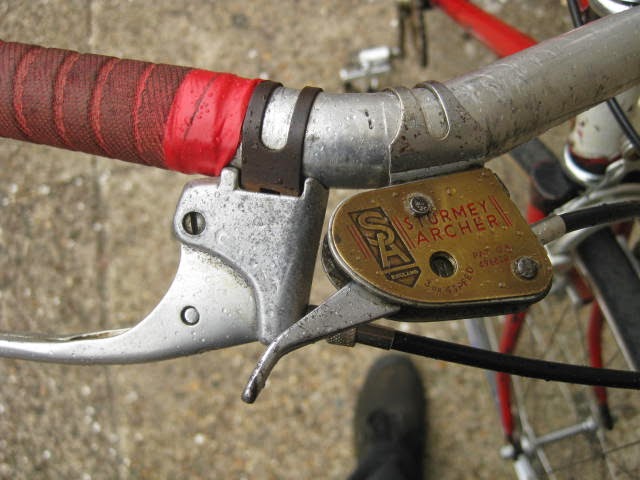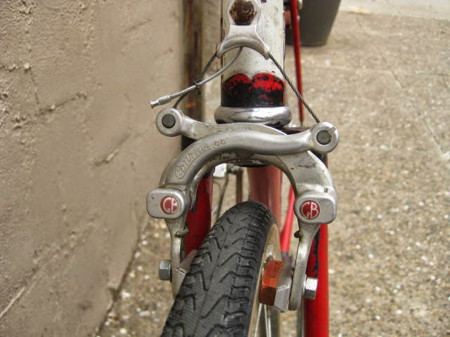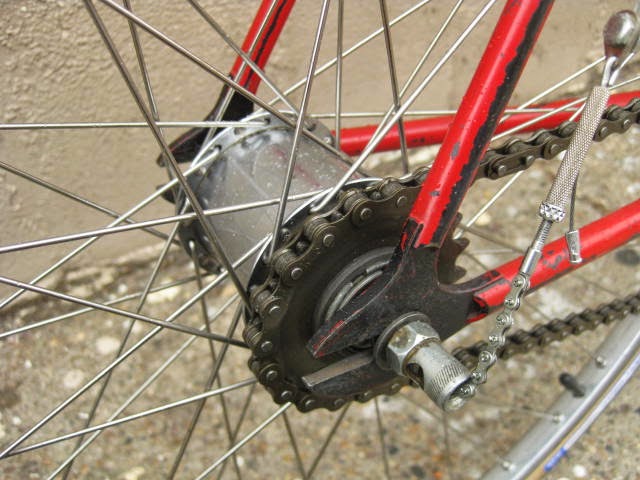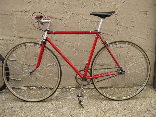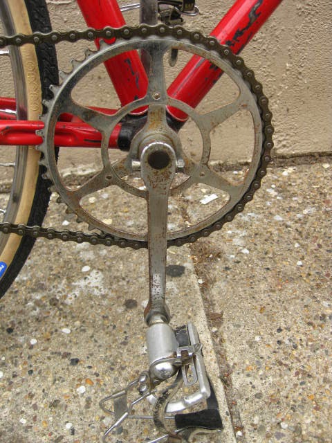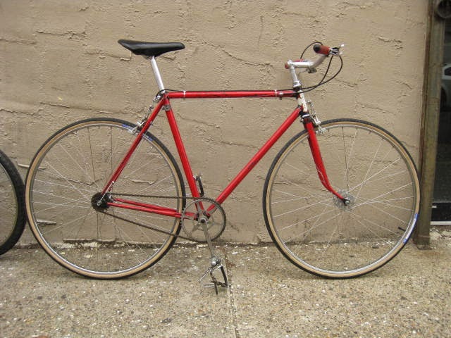 Initially, he said he wanted it set up with a three speed rear hub and upright bars, the ultimate light weight city bike. He also expressed the desire to build it with mostly older high end lightweight components. At first we used modern alloy rims, but encountered a problem with the rear brake reach. Then we needed to find an appropriate front hub. As luck would have it I found a stray complete front wheel consisting of and Air Lite hub laced to a Dunlop Special lightweight 27″ steel rim. I then found a matching Dunlop rim for the rear, which solved the brake reach problem and boom! we were getting somewhere. I found the brass face plate Sturmey Archer shifter which is era matched to the rear hub date code. Then I found the GB center pull brakes to give us the required reach with Scott Mathauser pads to ensure powerful stopping power with the lightweight steel rims. Josh sourced the Williams crank set and bottom bracket and the super cool Gipiemme aero type pedals with Oppy style toeclips. I had never seen these pedals until now, and I gotta say if i come across a set at a swap, I am gonna buy them for myself! Josh also provided the handle bars and super cool GB spear point stem. Our head mechanic Davis did all the build work to his usual high standards, and the result is quite pleasing, I think. We enjoy projects like this, exchanging ideas and coming up with awesome results. It is a bit of an unorthodox build and we are glad to have been a part of it! Enjoy.