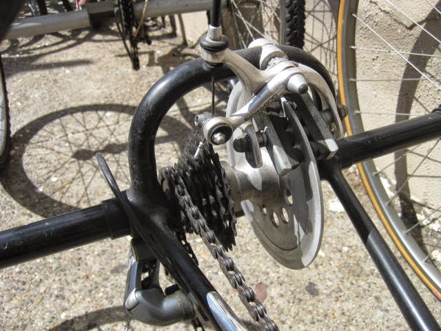 Comes with an extra set of wheels as well. Ready to ride, could of course use a tune up though. The trike has a couple unique features, like the rear caliper brake / disc brake combo, and the unusual pedal adapters, most likely for some sort of physical limitation of the previous owner. It is left wheel drive, so not set up for USA events. The smaller size seat tube is not unusual on these machines as the rider needs to lean way over in turns. Top tube length is more important. No shipping on this item, local pick up only. We can also deliver to Trexlertown swap meet this coming weekend if you like.