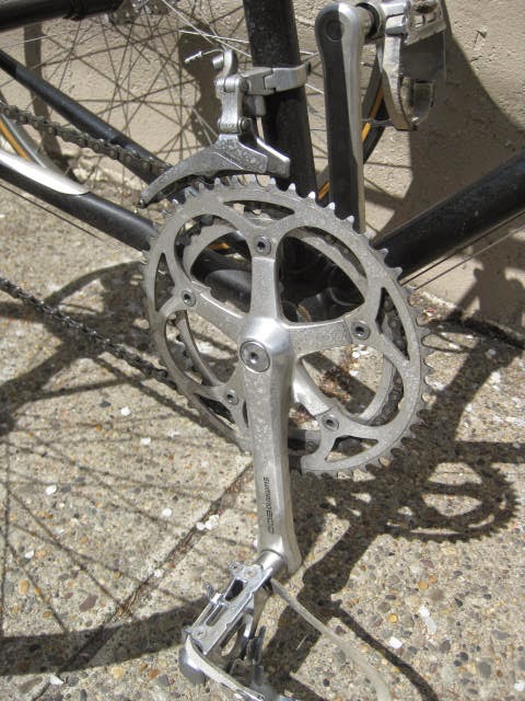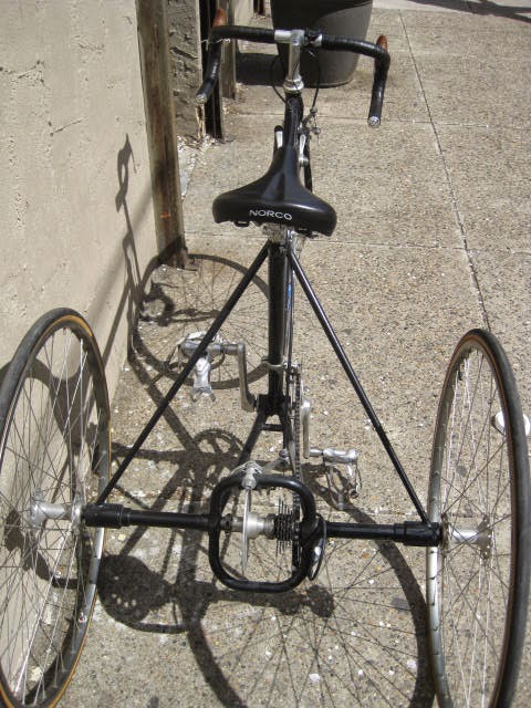 This racing tricycle came back from the midwest swaps over the weekend. Nice lightweight competition machine. Head tube has what looks like a “J” “H” “A” cycles decal and Joachim down tube decal. Unfamiliar with the marque. Built with Reynolds 531 tubing throughout and mostly Shimano 600 components. Here are the measurements.