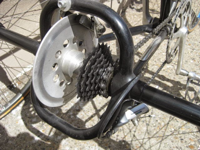 Comes with an extra set of wheels as well. Ready to ride, could of course use a tune up though. The trike has a couple unique features, like the rear caliper brake / disc brake combo, and the unusual pedal adapters, most likely for some sort of physical limitation of the previous owner. It is left wheel drive, so not set up for USA events. The smaller size seat tube is not unusual on these machines as the rider needs to lean way over in turns. Top tube length is more important. No shipping on this item, local pick up only. We can also deliver to Trexlertown swap meet this coming weekend if you like.