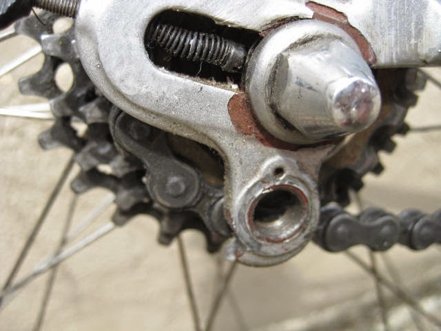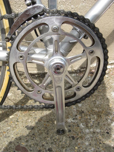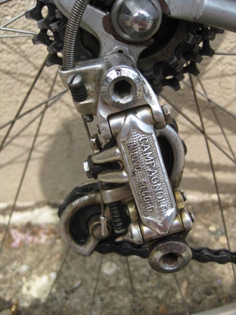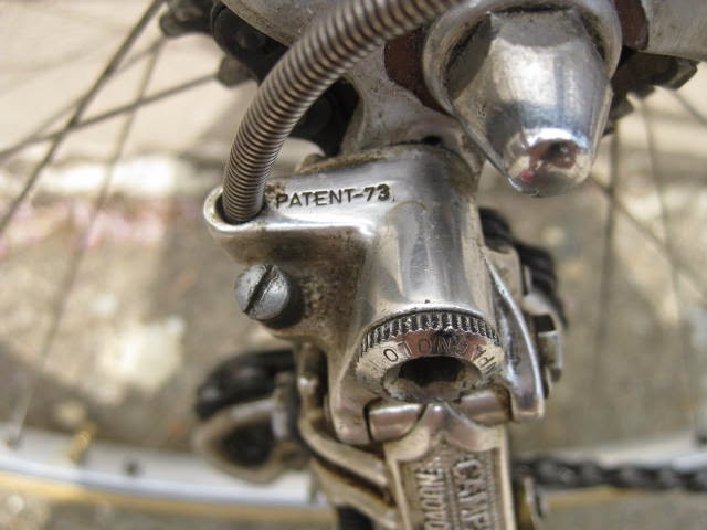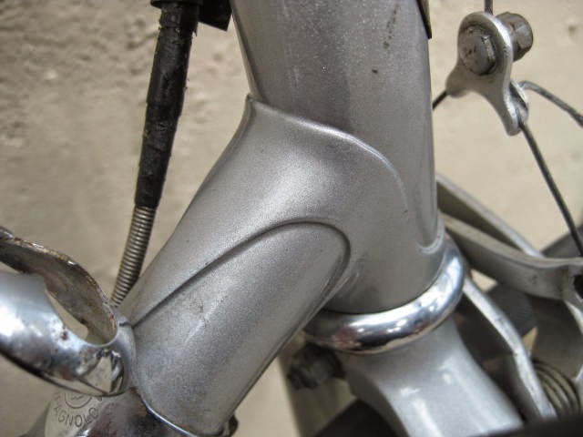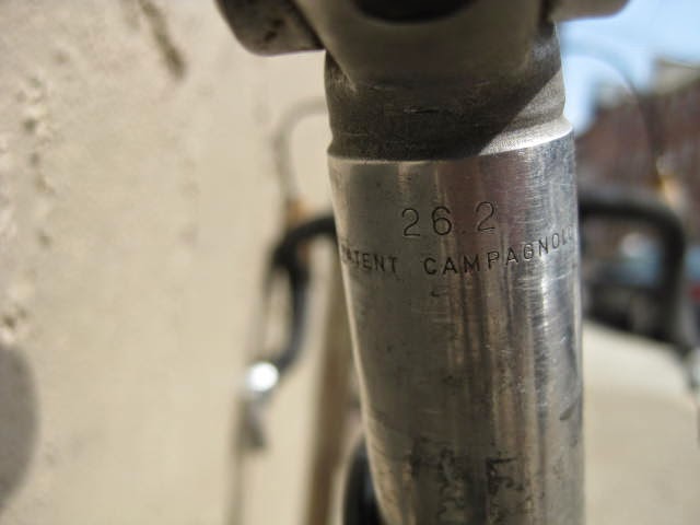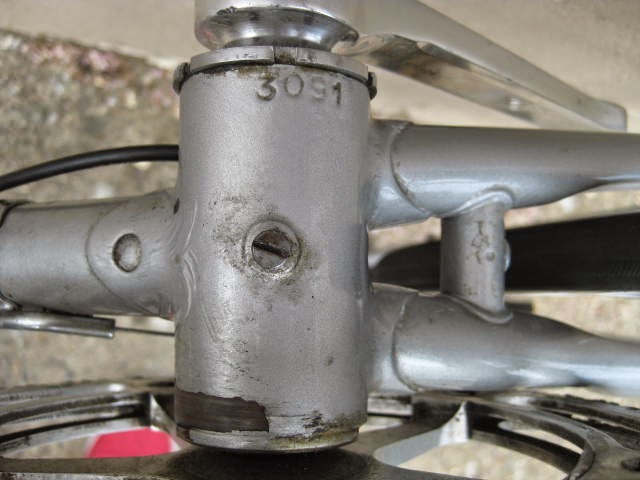 It has been re painted at some point and the only decal on it is the Reynolds 531 seat tube decal. I am not sure if the frame is built with Reynolds 531 or Columbus tubing, Reynolds was being phased out in 1963, although it was still an option if the customer wanted it. It has no holes in the fork tangs or the head lugs which started to appear in 1968. It also still has an oiler port on the BB shell and the drain hole in the bottom of the BB shell which disappeared in the mid 60’s. It also has the spring anchor hole on the the rear derailleur hanger to accomodate the Campagnolo Sport derailleur, which disappeared in the mid 60’s. The serial number is 3091 stamped on the BB shell, but Cinelli serial numbers are all over the place, so that does not really help in dating it. All the above info was via Chuck Schmidt’s Velo Retro page. Cinelli timeline Velo Retro